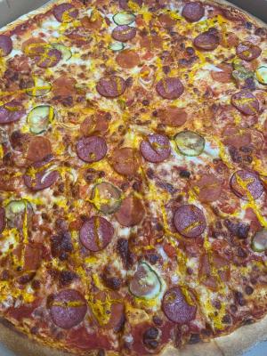 Состав: пицца-соус, моцарелла, бекон, салями, пеперони, огурец маринованный, помидор, соус горчичный