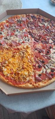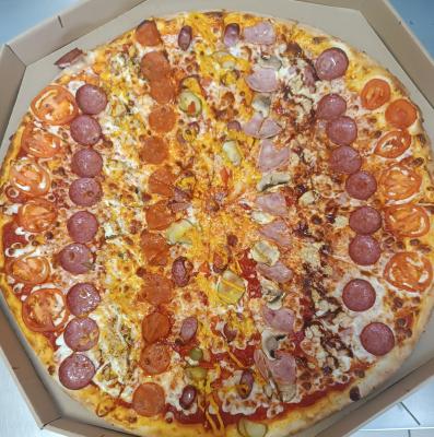 - мега-пицца "Восемь ломтиков" (60 см, 2000 г): моцарелла, ветчина, грибы, колбаски охотничьи, огурец, курица, помидор, пепперони, перец сладкий, салями, перец халапеньо