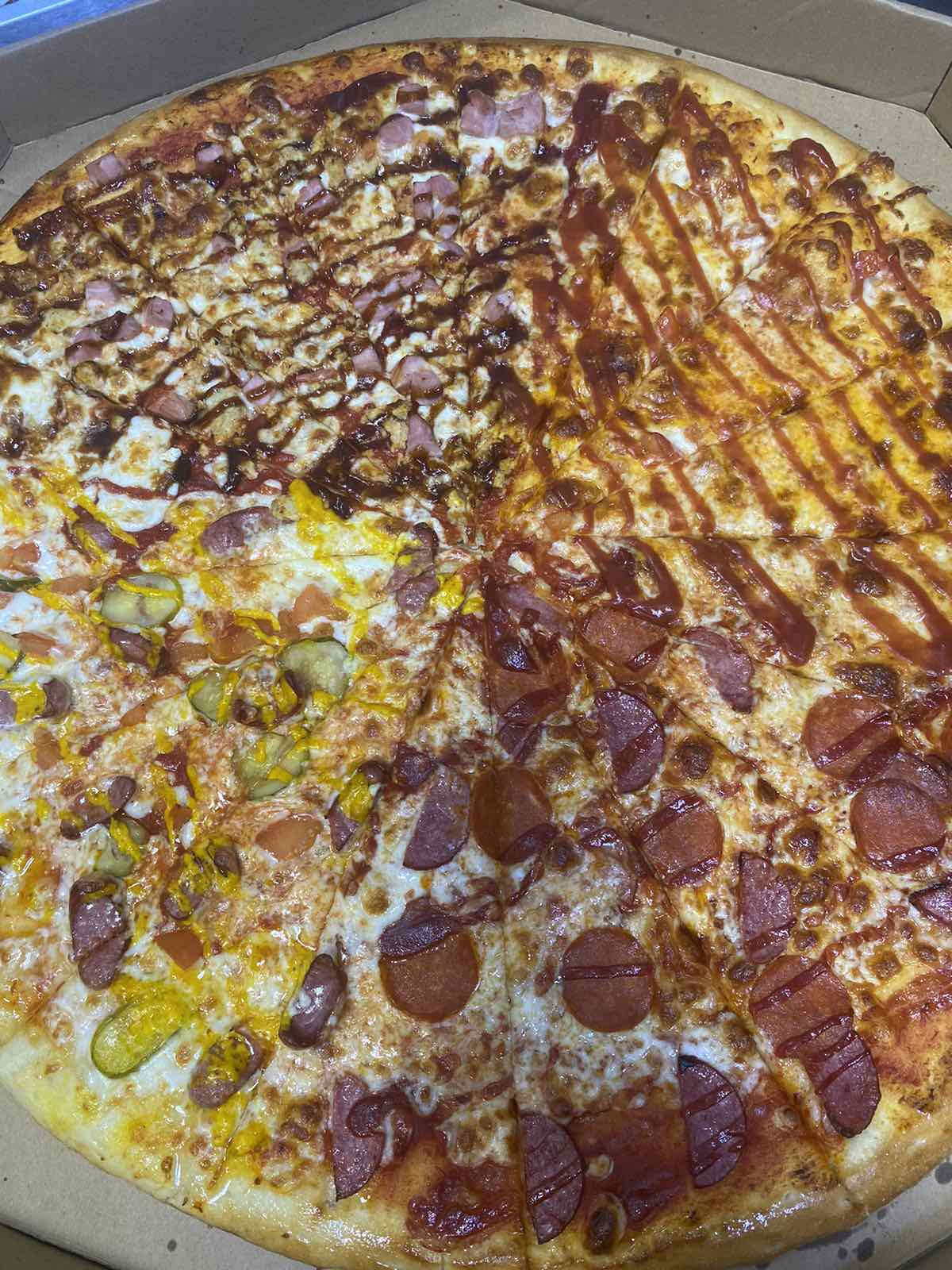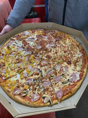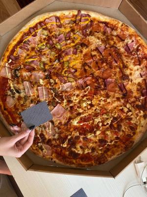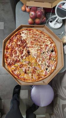 Первый раз делали заказ, заказали в 20:40, привезли в 21:40,она пришла просто огромная, сказать что в восторге ничего не сказать, все очень вкусно, заказали мясную и остались довольны. Теперь всегда на компанию будем брать, советую 🔥