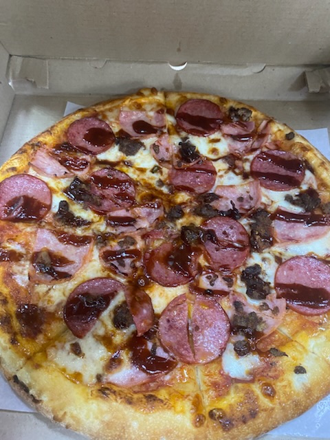 Состав: пицца-соус, моцарелла, колбаски охотничьи, пепперони, салями, курица, бекон, помидор, огурец маринованный, соус горчичный, соус барбекю, лук маринованный, сыр чеддер