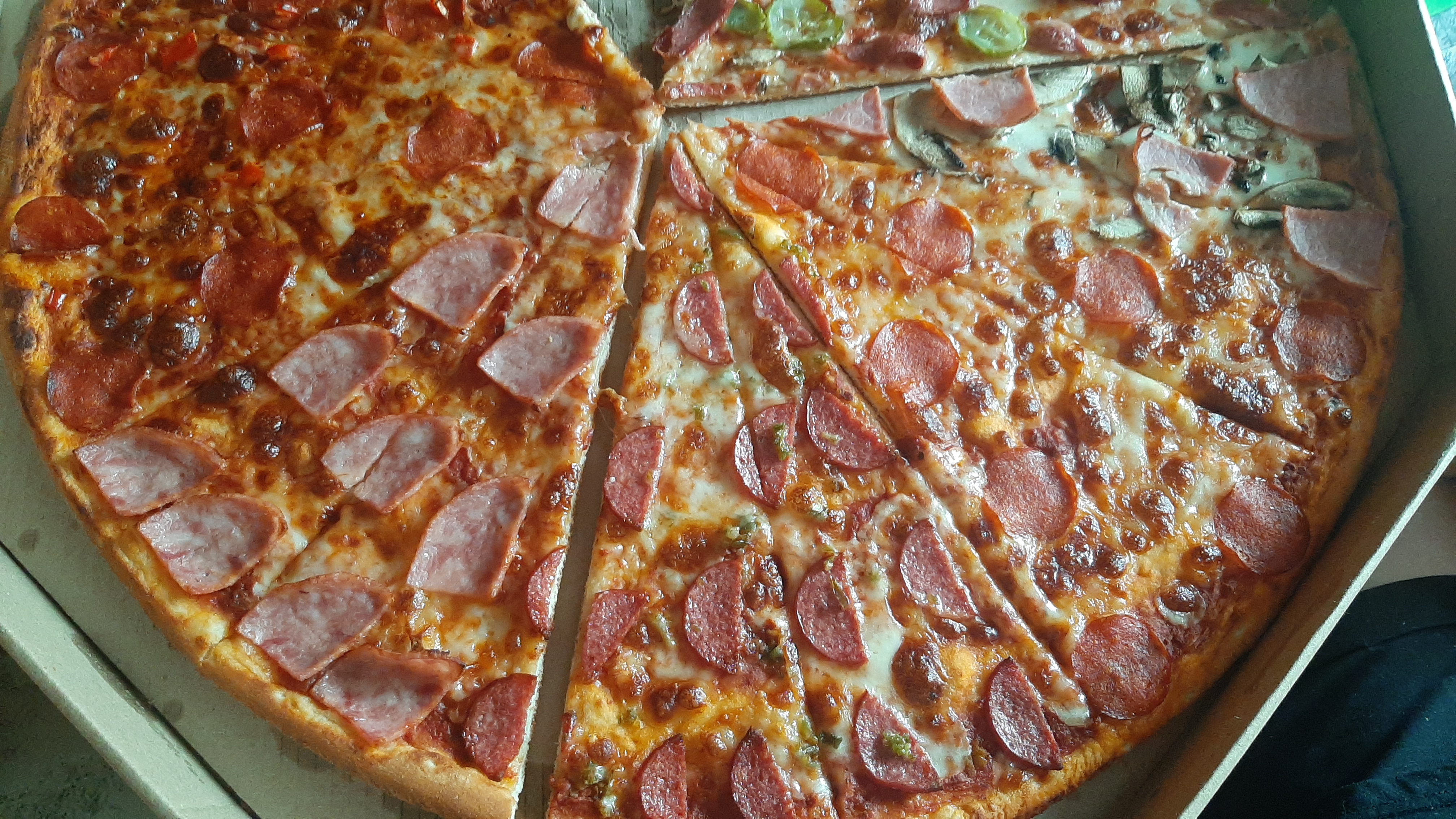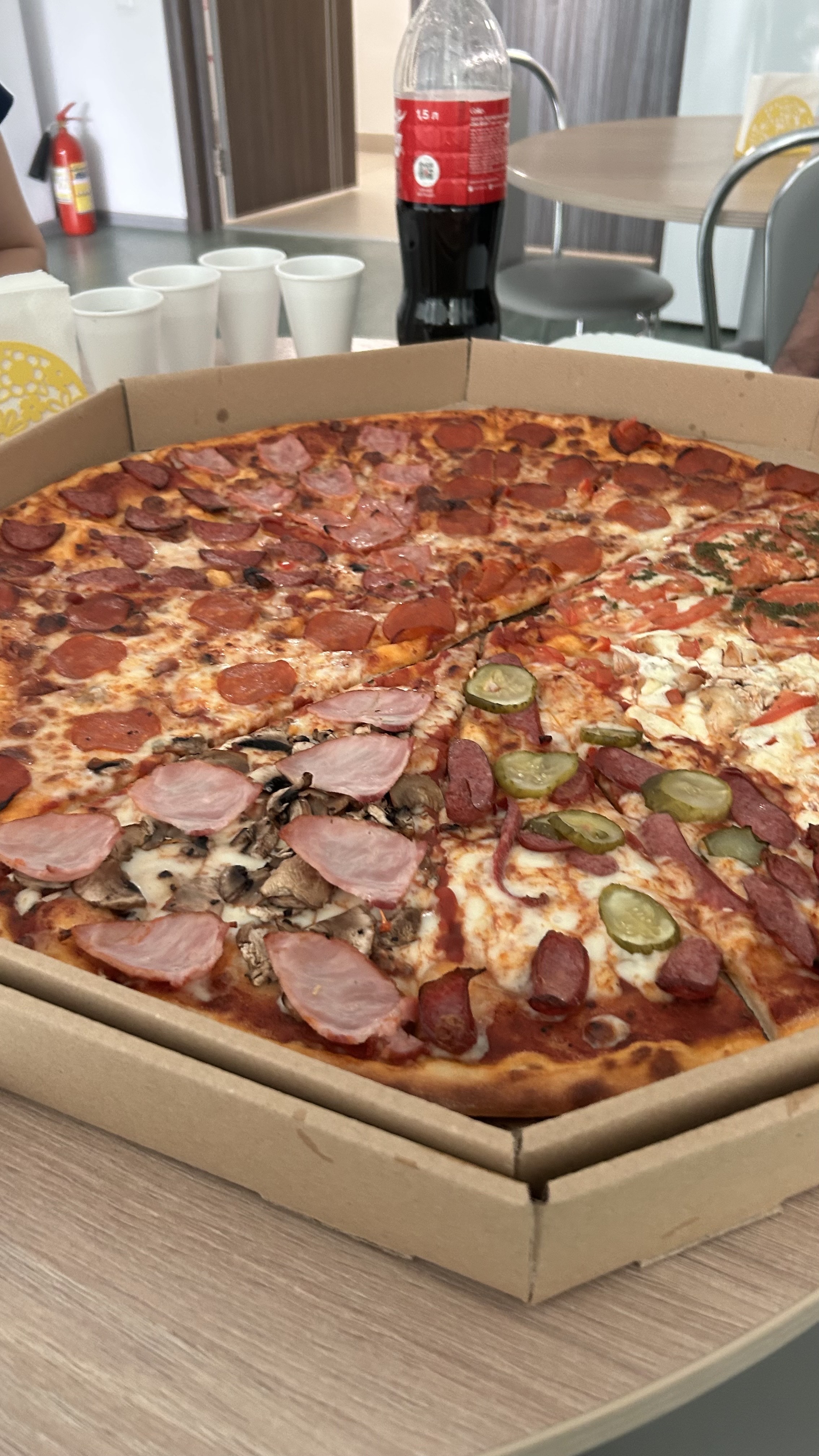 - мега-пицца "Компанейская" (60 см, 2000 г): моцарелла, пицца-соус, помидор, ветчина куриная, пепперони, бекон, лук маринованный, колбаски охотничьи, огурцы маринованные