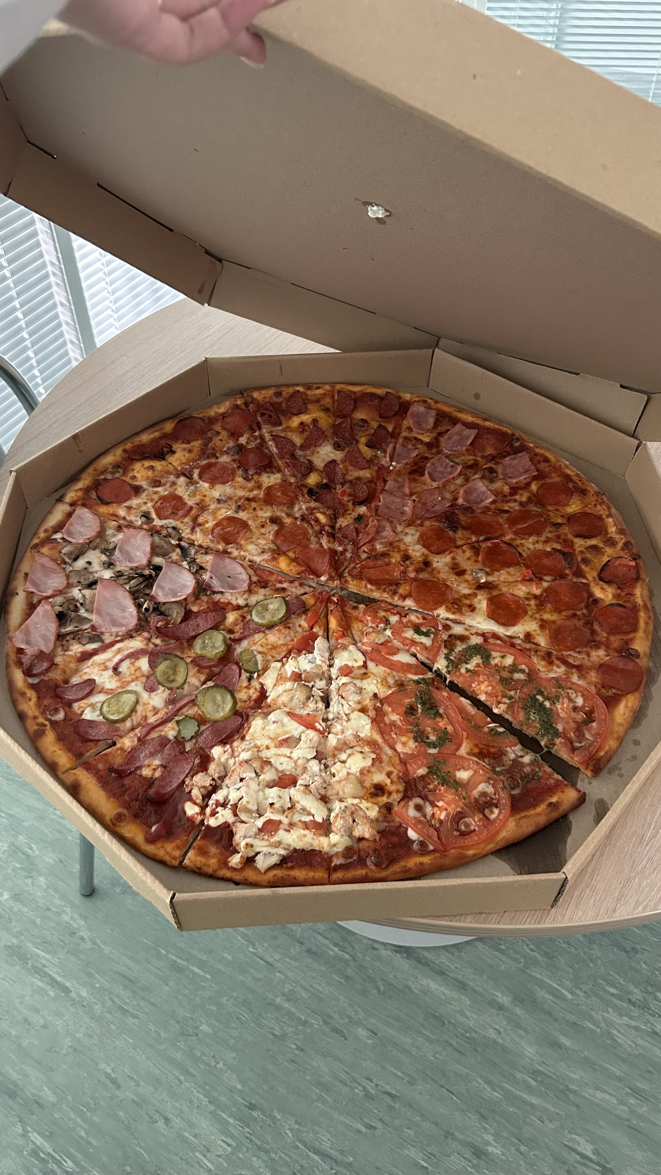 Состав: моцарелла, ветчина, грибы, колбаски охотничьи, огурец, курица, помидор, пепперони, перец сладкий, салями, перец халапеньо