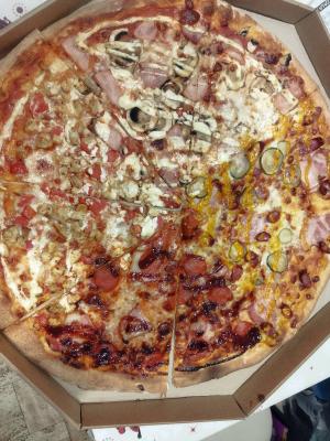 - мега-пицца "Восемь ломтиков" (60 см, 2000 г): моцарелла, ветчина, грибы, колбаски охотничьи, огурец, курица, помидор, пепперони, перец сладкий, салями, перец халапеньо