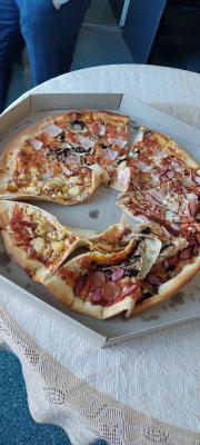 - мега-пицца "Компанейская" (60 см, 2000 г): моцарелла, пицца-соус, помидор, ветчина куриная, пепперони, бекон, лук маринованный, колбаски охотничьи, огурцы маринованные