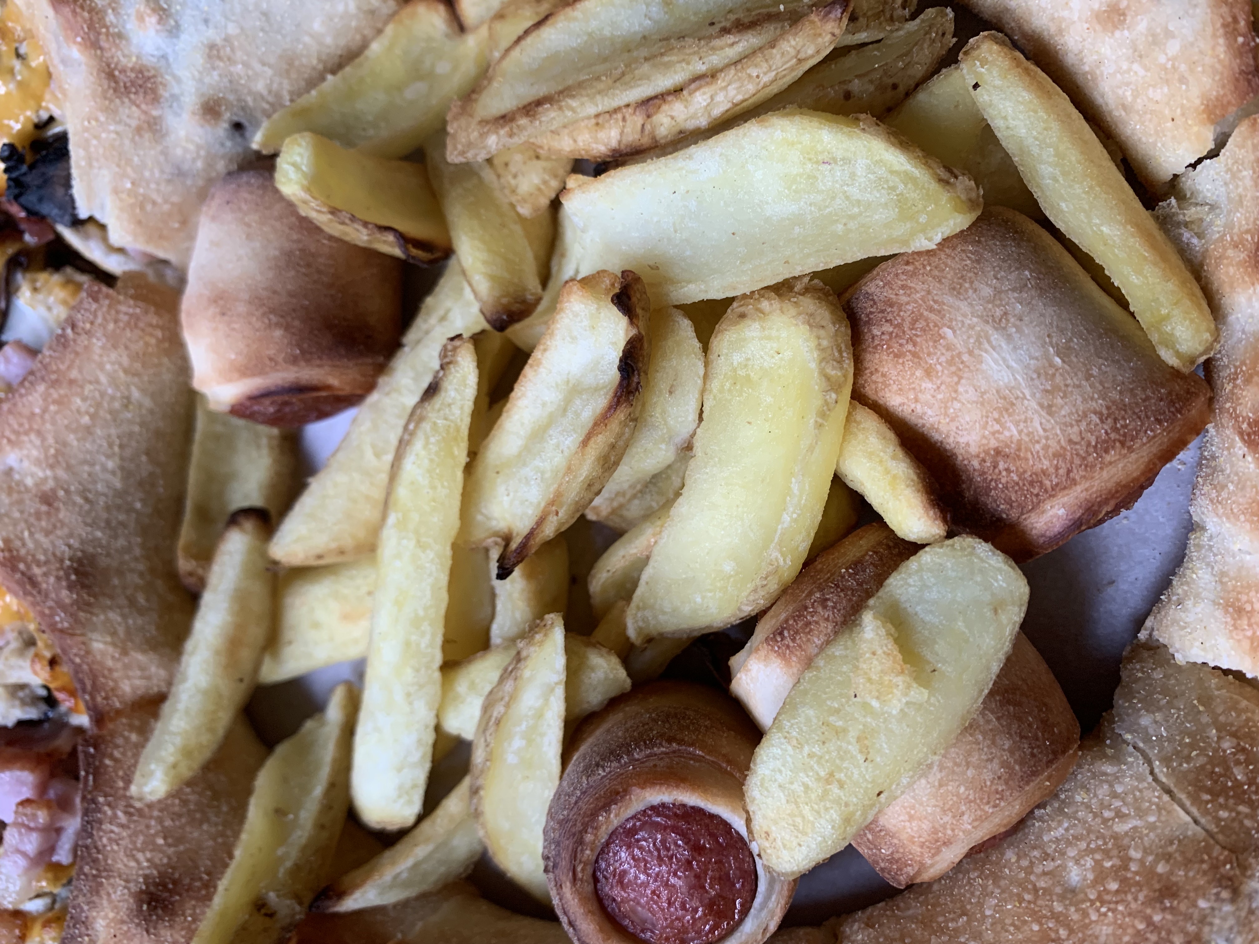 Состав: сыр, курица, грибы жареные, бекон, соус ранч, сосиски "Хот", чеддер, картофель по-деревенски