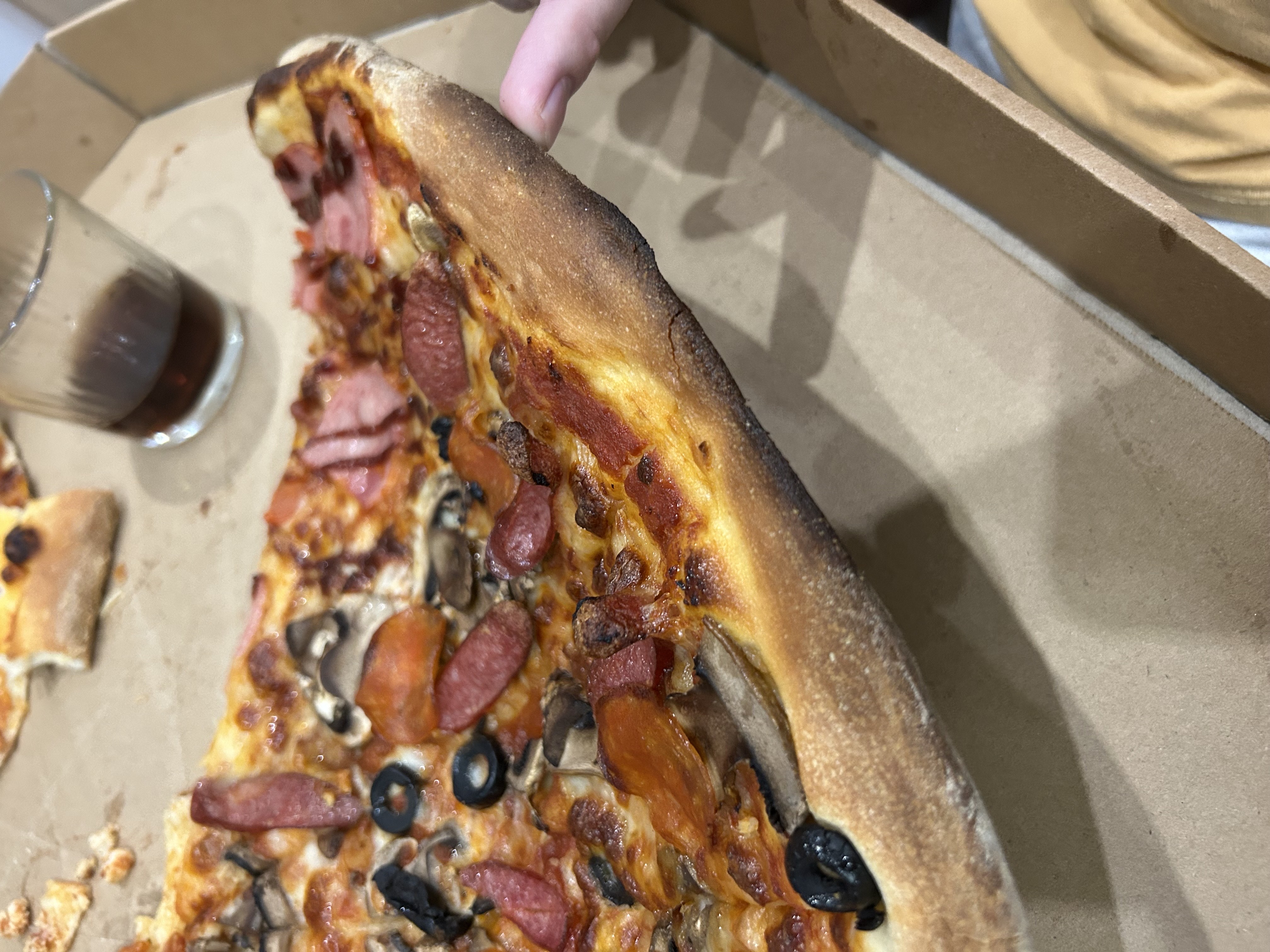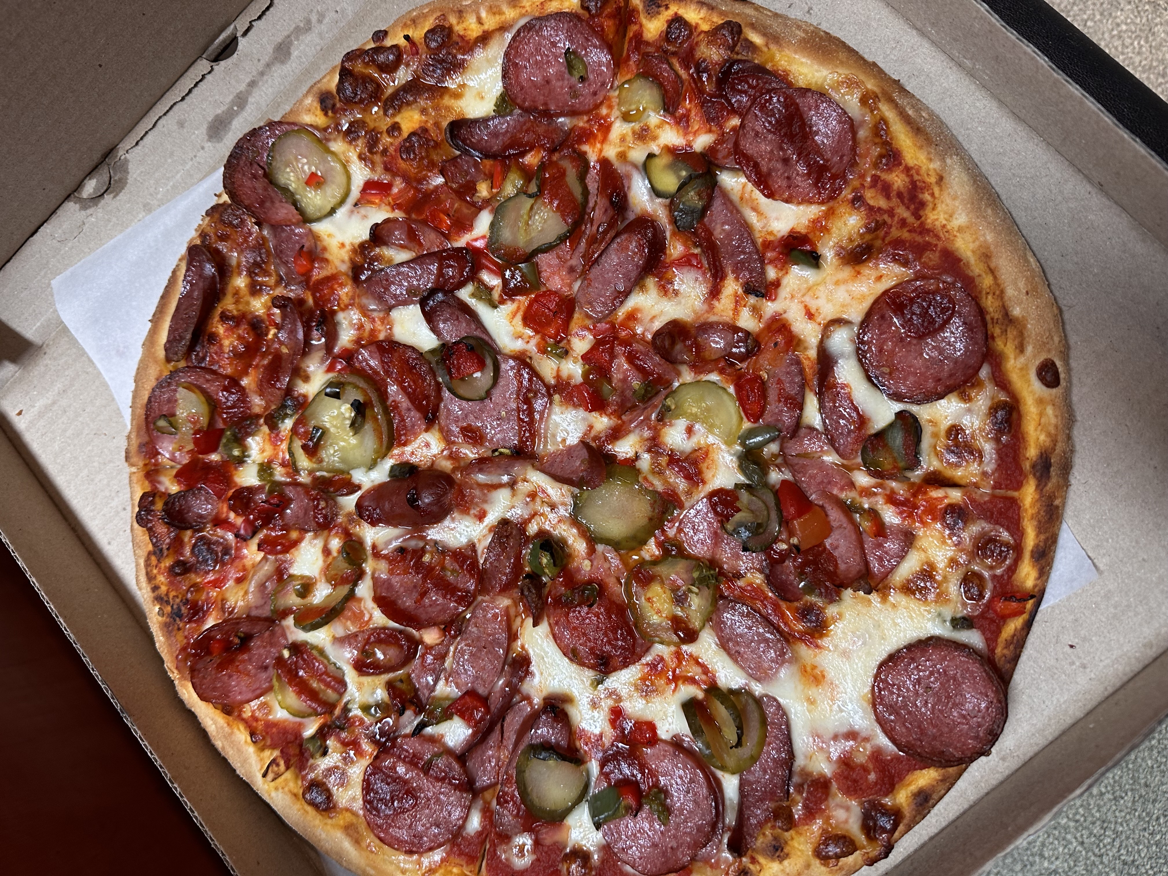 Состав: моцарелла, ветчина, грибы, колбаски охотничьи, огурец, курица, помидор, пепперони, перец сладкий, салями, перец халапеньо