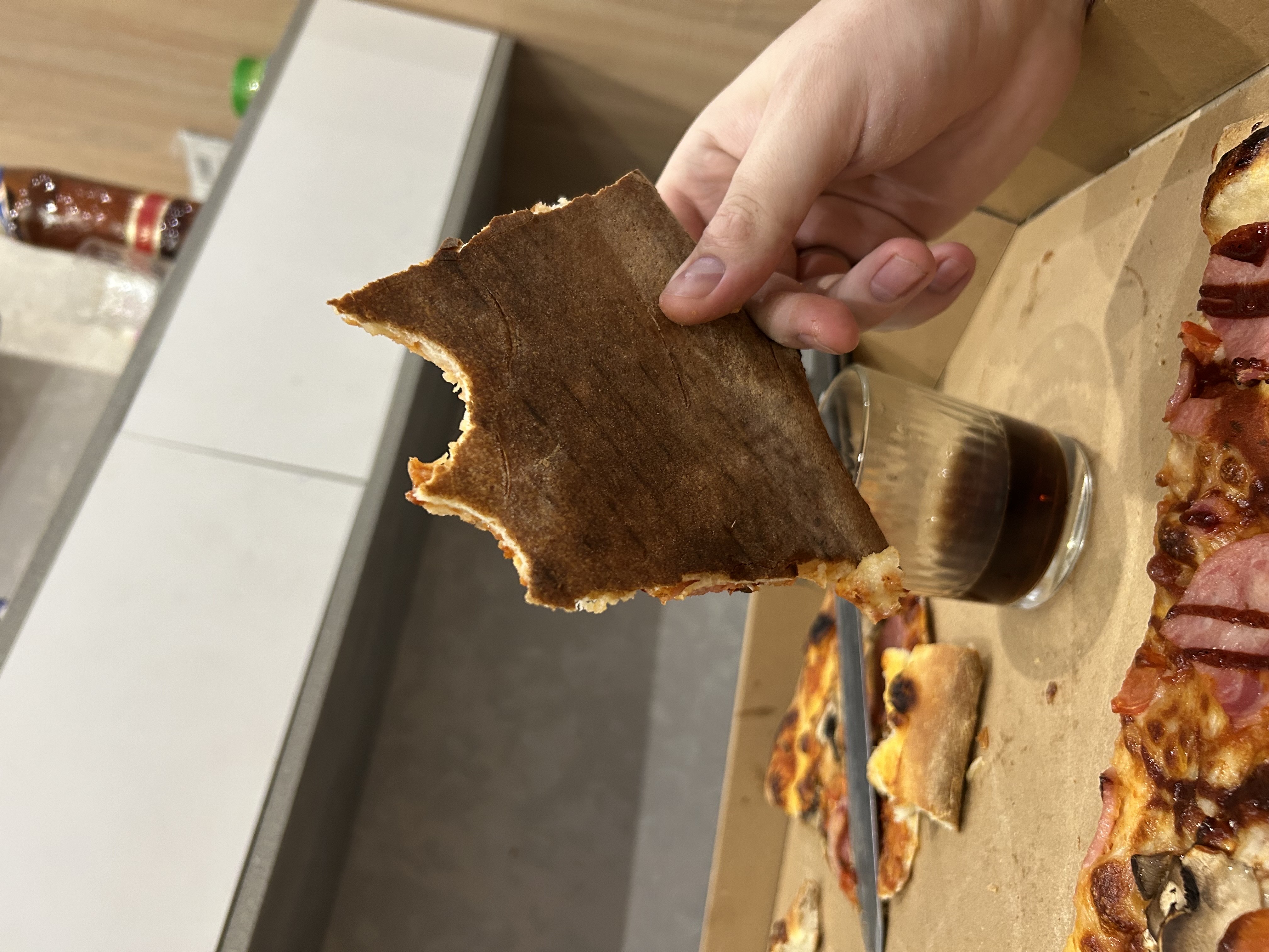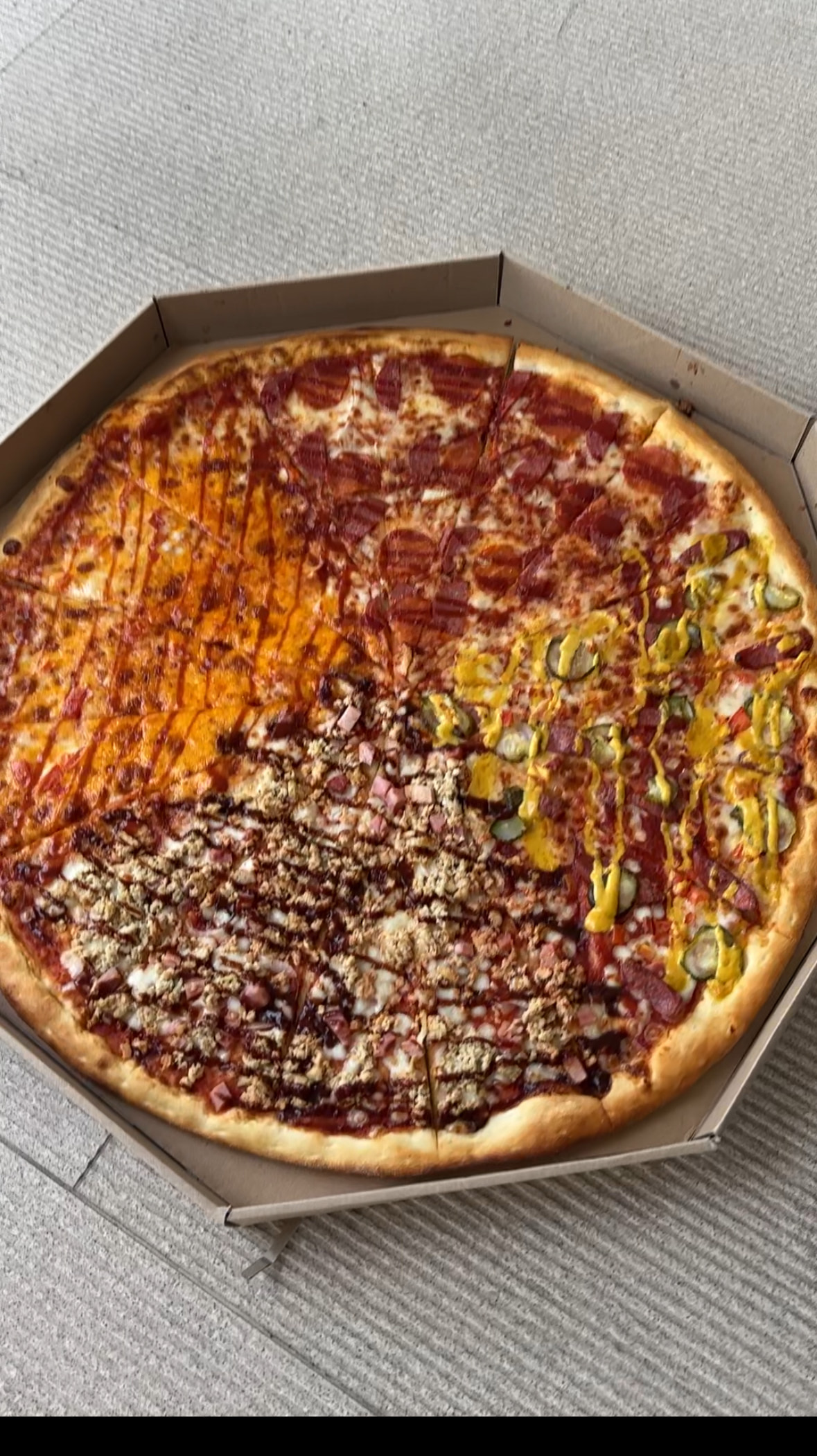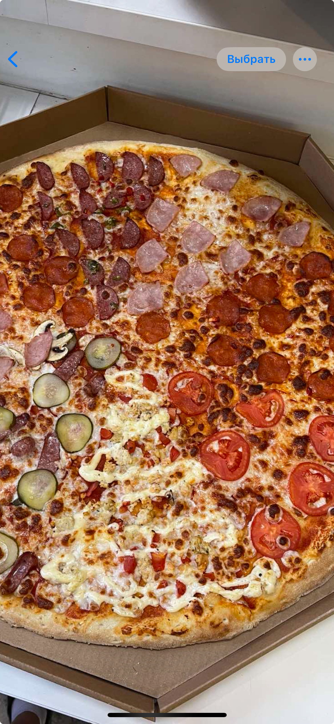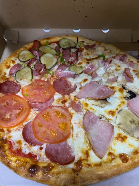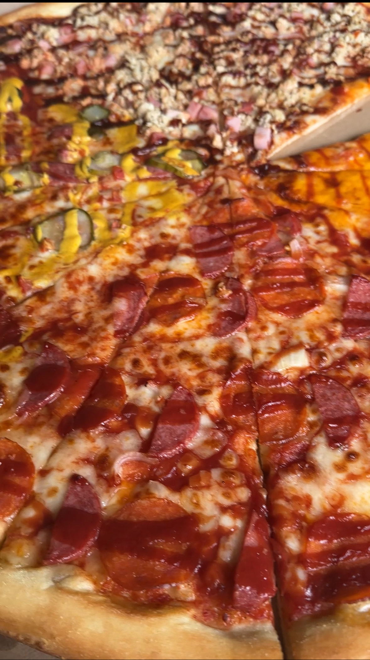 Состав: моцарелла, пицца-соус, ветчина, бекон, томат, огурец маринованный, чеддер, соус бургер