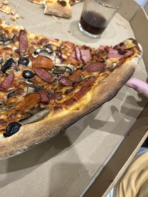 Состав: пицца-соус, моцарелла, бекон, куриная ветчина, колбаски охотничьи, салями, пепперони, помидор, огурец маринованный, маслины, соус бургер