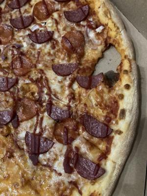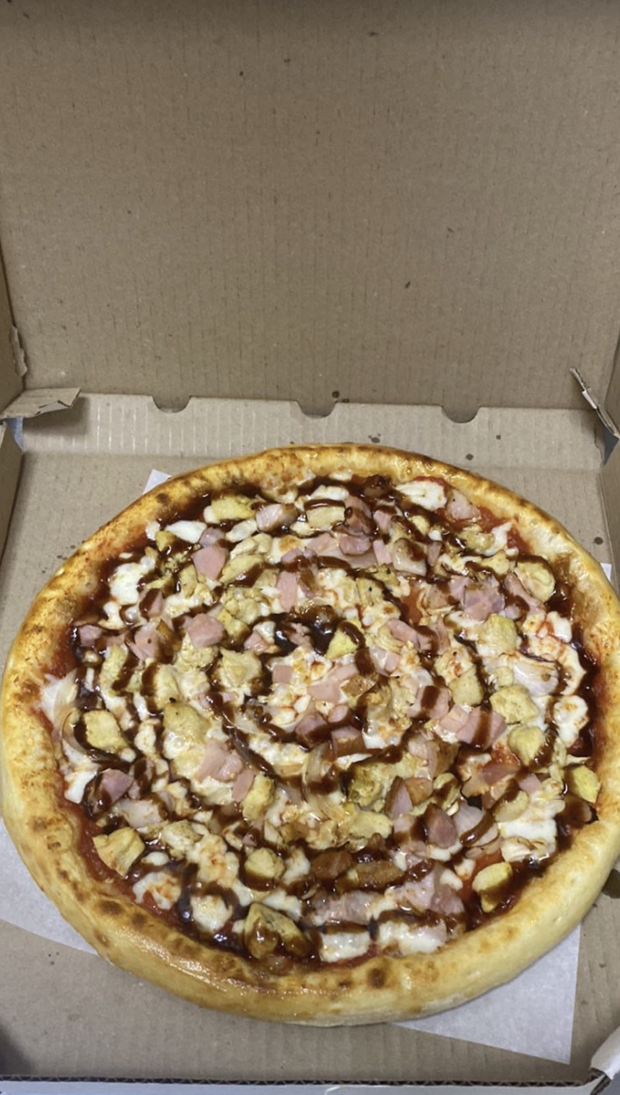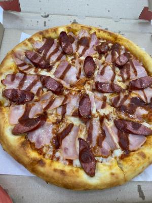 Состав: пицца-соус, моцарелла, колбаски охотничьи, пепперони, салями, курица, бекон, помидор, огурец маринованный, соус горчичный, соус барбекю, лук маринованный, сыр чеддер