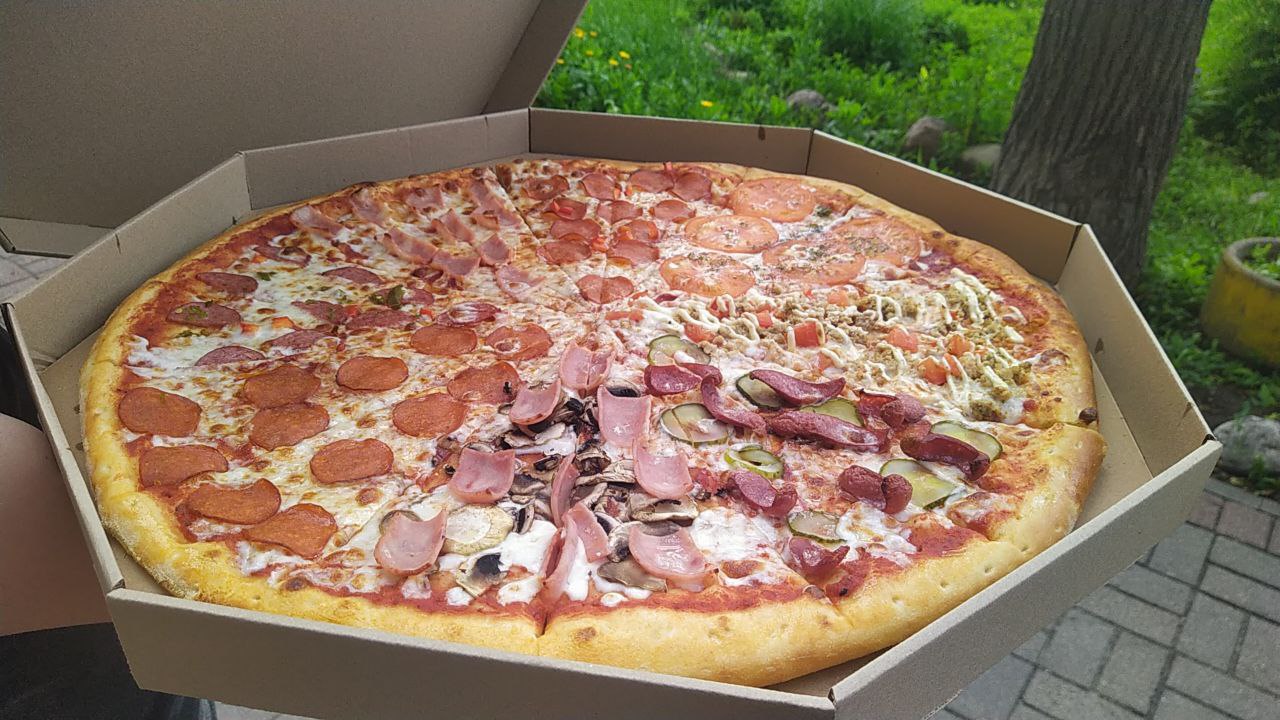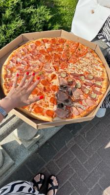 - мега-пицца "Компанейская" (60 см, 2000 г): моцарелла, пицца-соус, помидор, ветчина куриная, пепперони, бекон, лук маринованный, колбаски охотничьи, огурцы маринованные