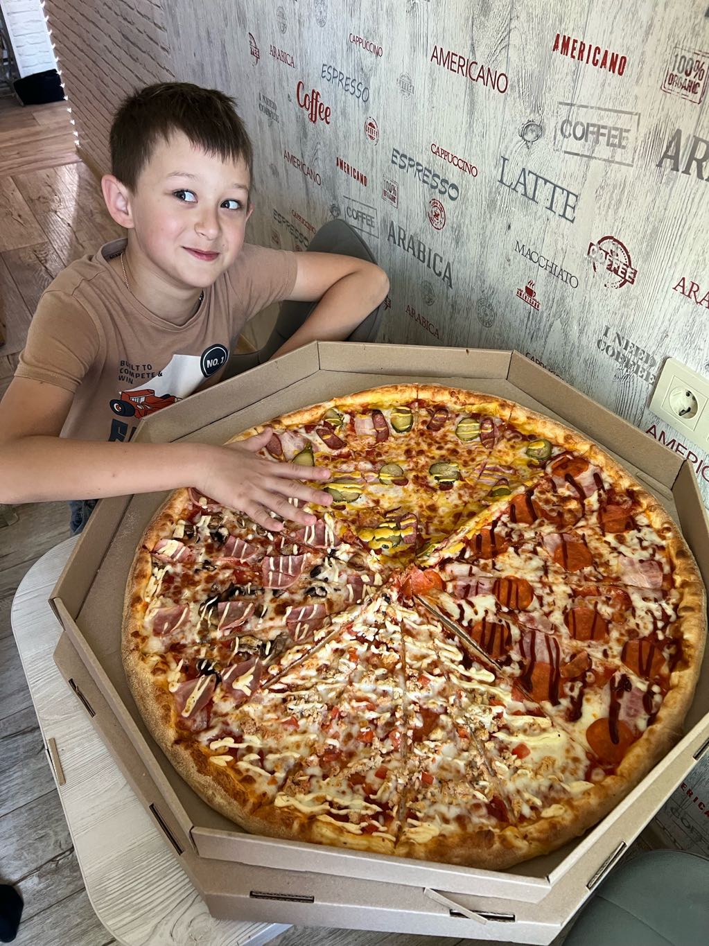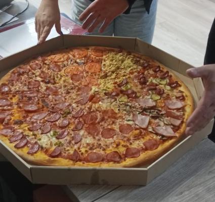 - мега-пицца "Семейная" (60 см, 2000 г): сыр моцарелла, помидор, салями, курица, огурец, ветчина, грибы, пепперони, сыр Чеддер