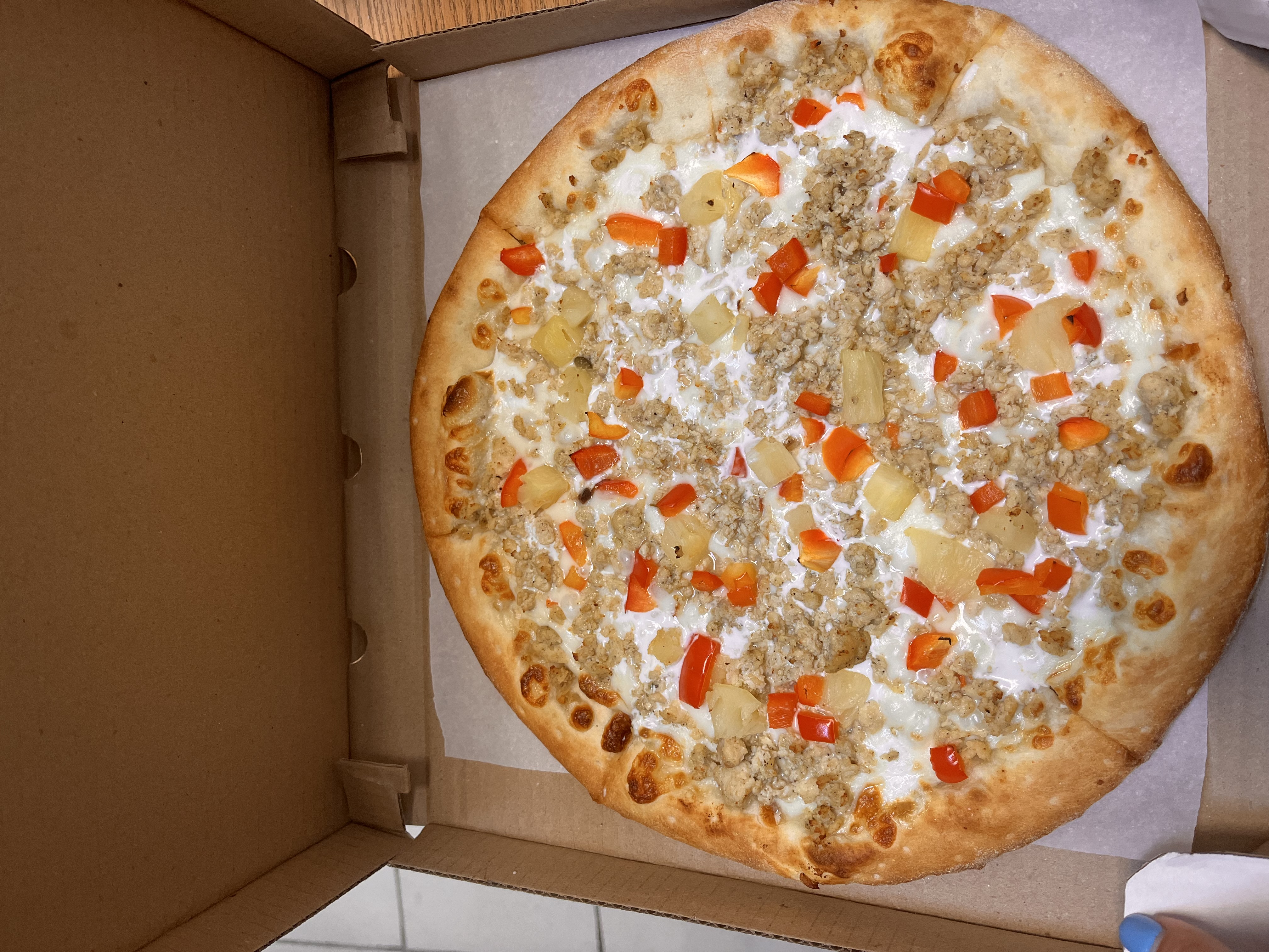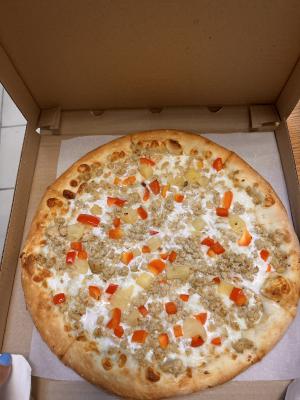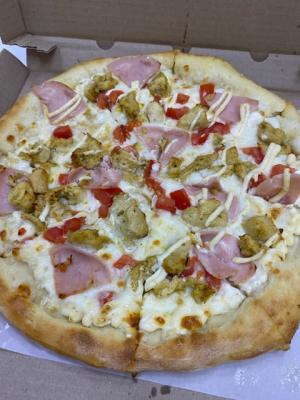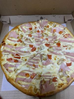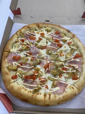 Состав: моцарелла, чесночный соус, кетчуп, ветчина, грибы, пепперони, курица, томат, фета