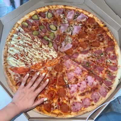 - мега-пицца "Восемь ломтиков" (60 см, 2000 г): моцарелла, ветчина, грибы, колбаски охотничьи, огурец, курица, помидор, пепперони, перец сладкий, салями, перец халапеньо