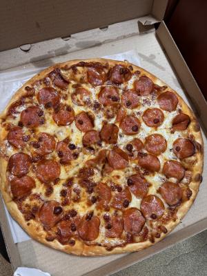 Состав: моцарелла, пицца-соус, бекон, пепперони, колбаски охотничьи, перец