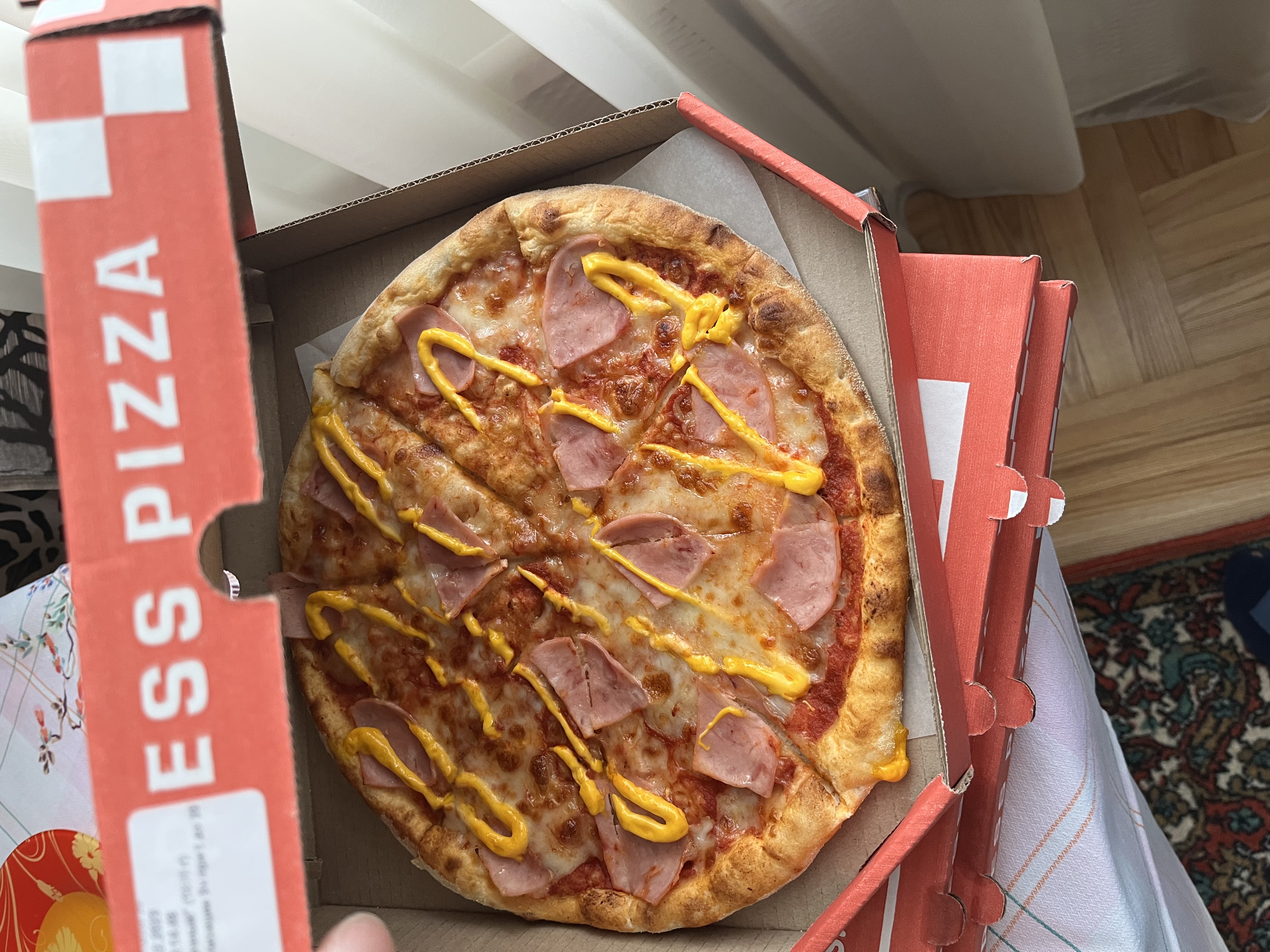 Состав: моцарелла, пицца-соус, ветчина, бекон, томат, огурец маринованный, чеддер, соус бургер