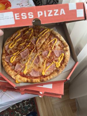 Состав: пицца-соус, моцарелла, бекон, салями, пеперони, огурец маринованный, помидор, соус горчичный