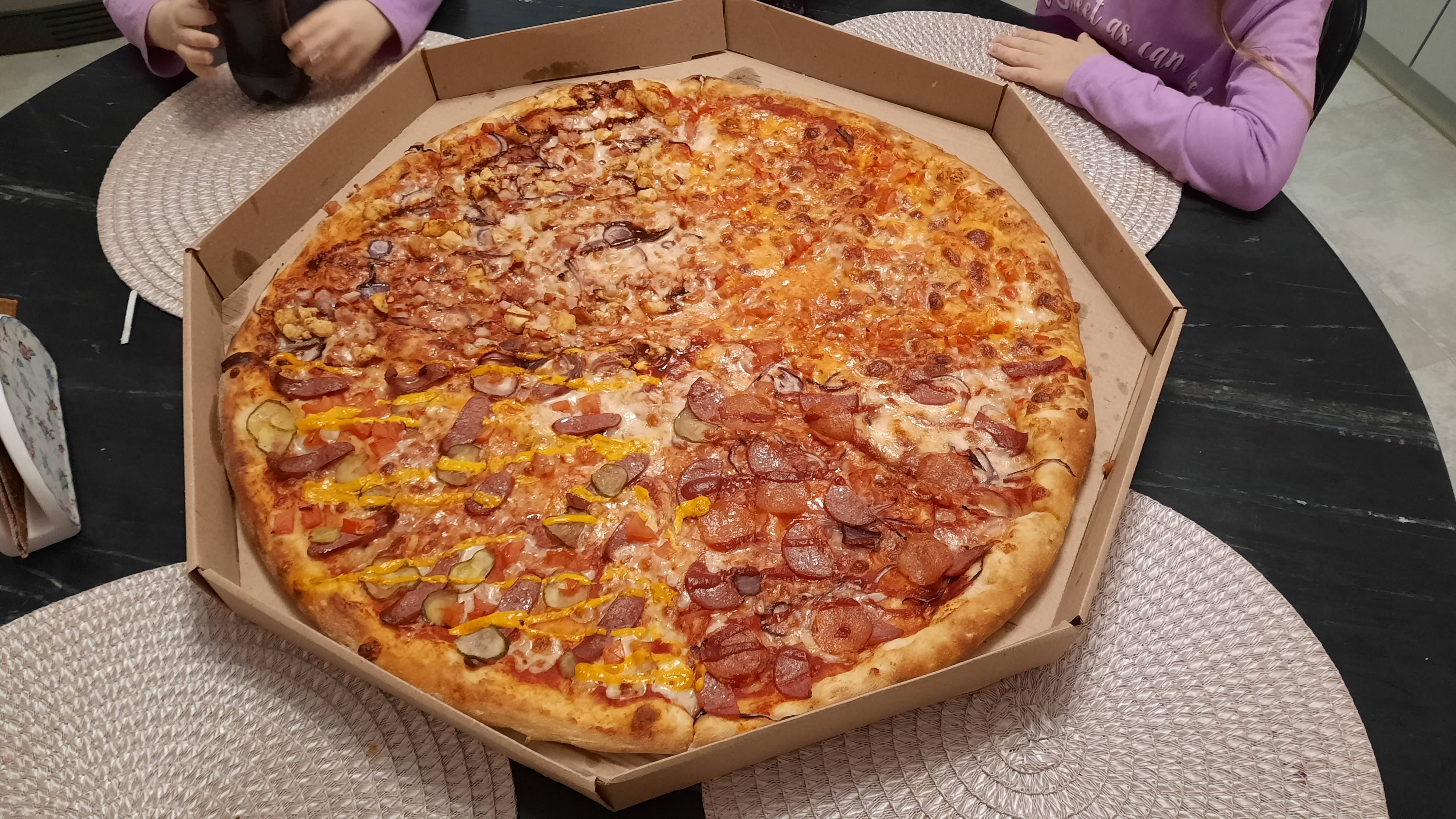 - мега-пицца "Восемь ломтиков" (60 см, 2000 г): моцарелла, ветчина, грибы, колбаски охотничьи, огурец, филе цыпленка рубленое, помидор, пепперони, перец сладкий, салями, перец халапеньо
