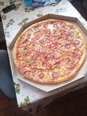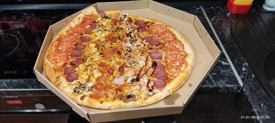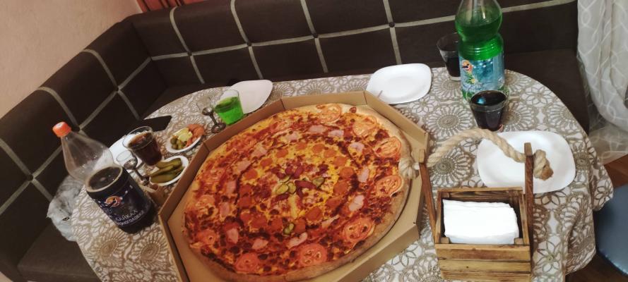 - мега-пицца "Компанейская" (60 см, 2000 г): моцарелла, пицца-соус, помидор, ветчина куриная, пепперони, бекон, лук маринованный, колбаски охотничьи, огурцы маринованные