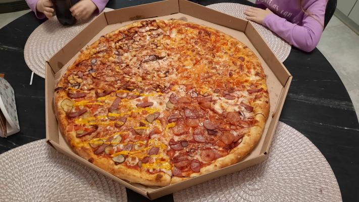 - мега-пицца "Семейная" (60 см, 2000 г): сыр моцарелла, помидор, салями, филе цыпленка рубленое, огурец, ветчина, грибы, пепперони, сыр Чеддер