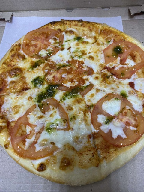 Состав: пицца-соус, моцарелла, помидор кубик, помидор слайс, соус песто