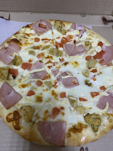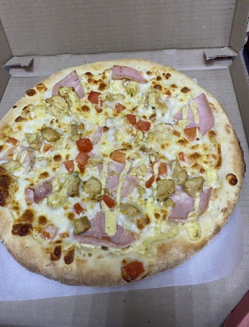 Состав: моцарелла, чесночный соус, кетчуп, ветчина, грибы, пепперони, курица, томат, фета