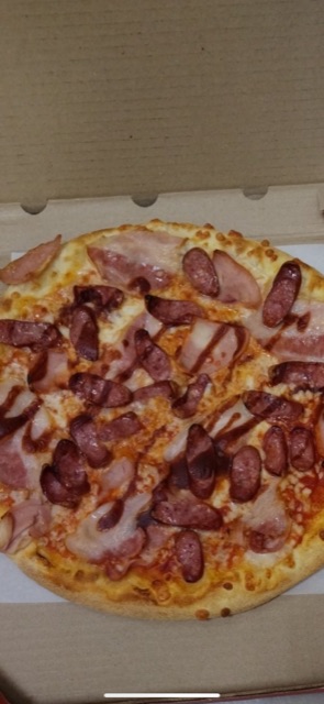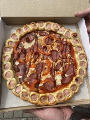 Состав: пицца-соус, моцарелла, колбаски охотничьи, пепперони, салями, курица, бекон, помидор, огурец маринованный, соус горчичный, соус барбекю, лук маринованный, сыр чеддер