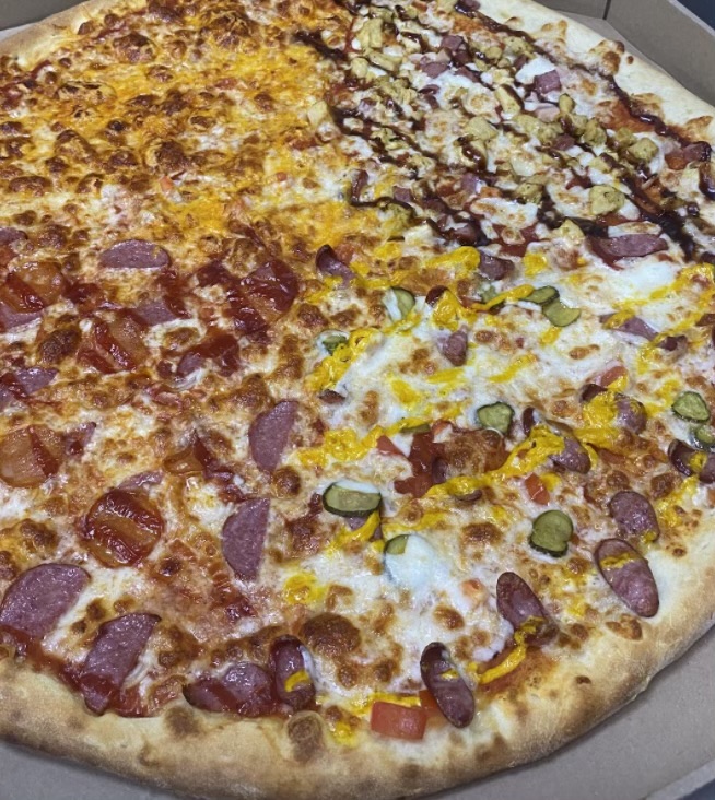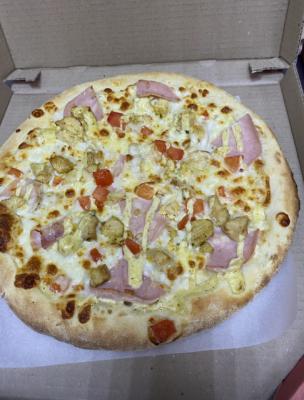 Состав: моцарелла, пицца-соус, ветчина, бекон, томат, огурец маринованный, чеддер, соус бургер