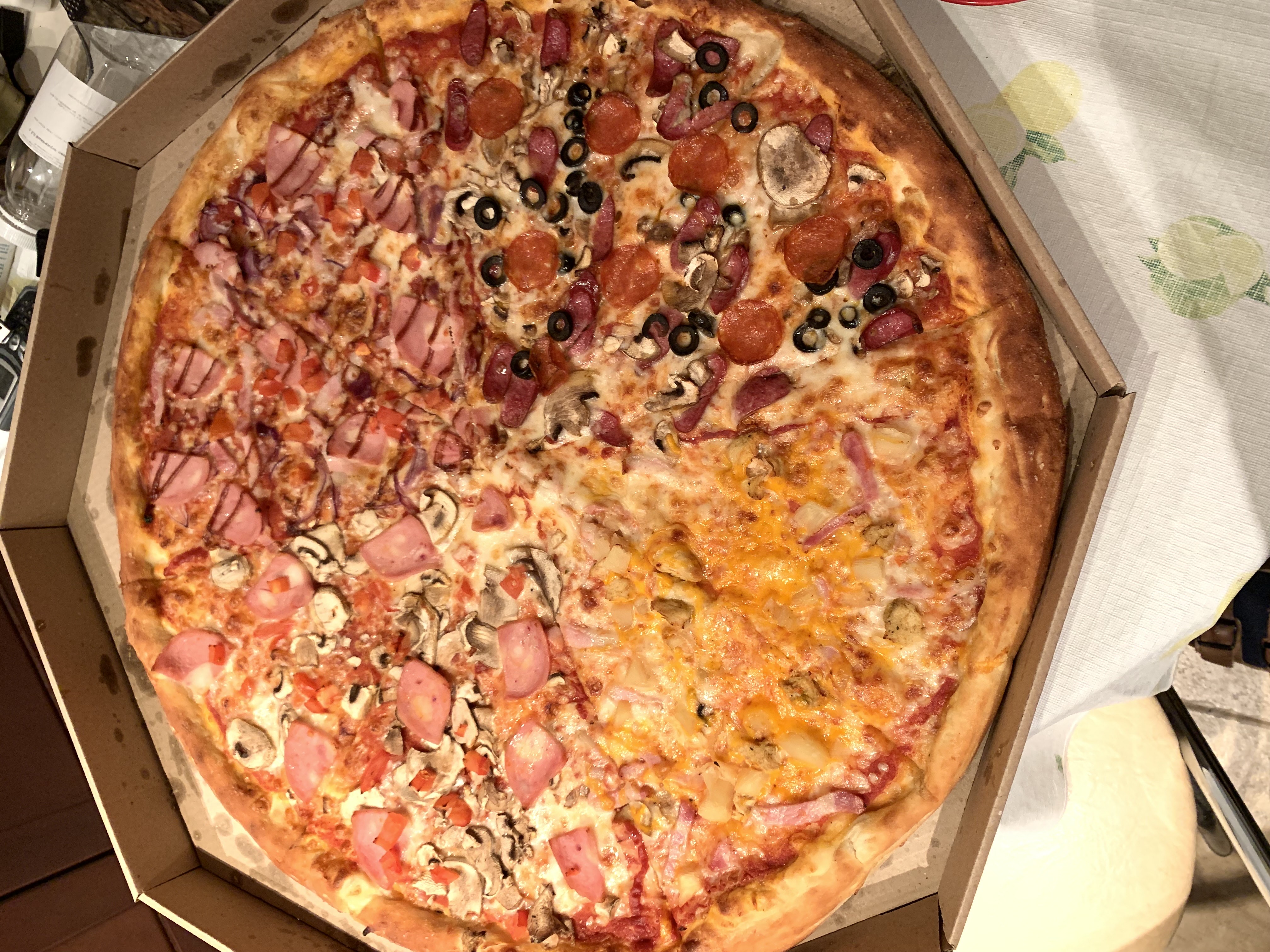 - мега-пицца "Компанейская" (60 см, 2000 г): моцарелла, пицца-соус, помидор, ветчина куриная, пепперони, бекон, лук маринованный, колбаски охотничьи, огурцы маринованные