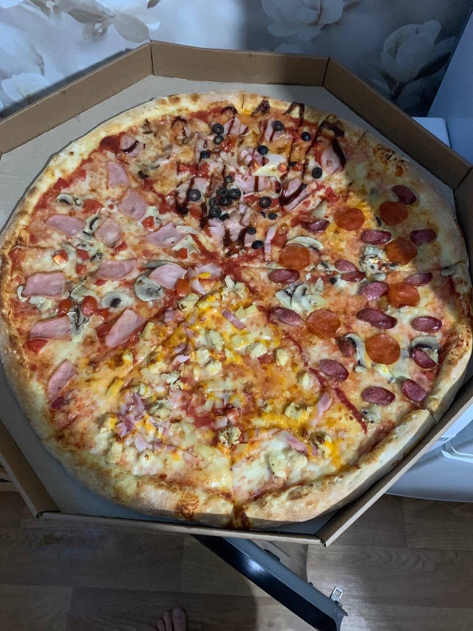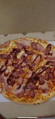 Состав: пицца-соус, моцарелла, бекон, куриная ветчина, колбаски охотничьи, салями, пепперони, помидор, огурец маринованный, маслины, соус бургер