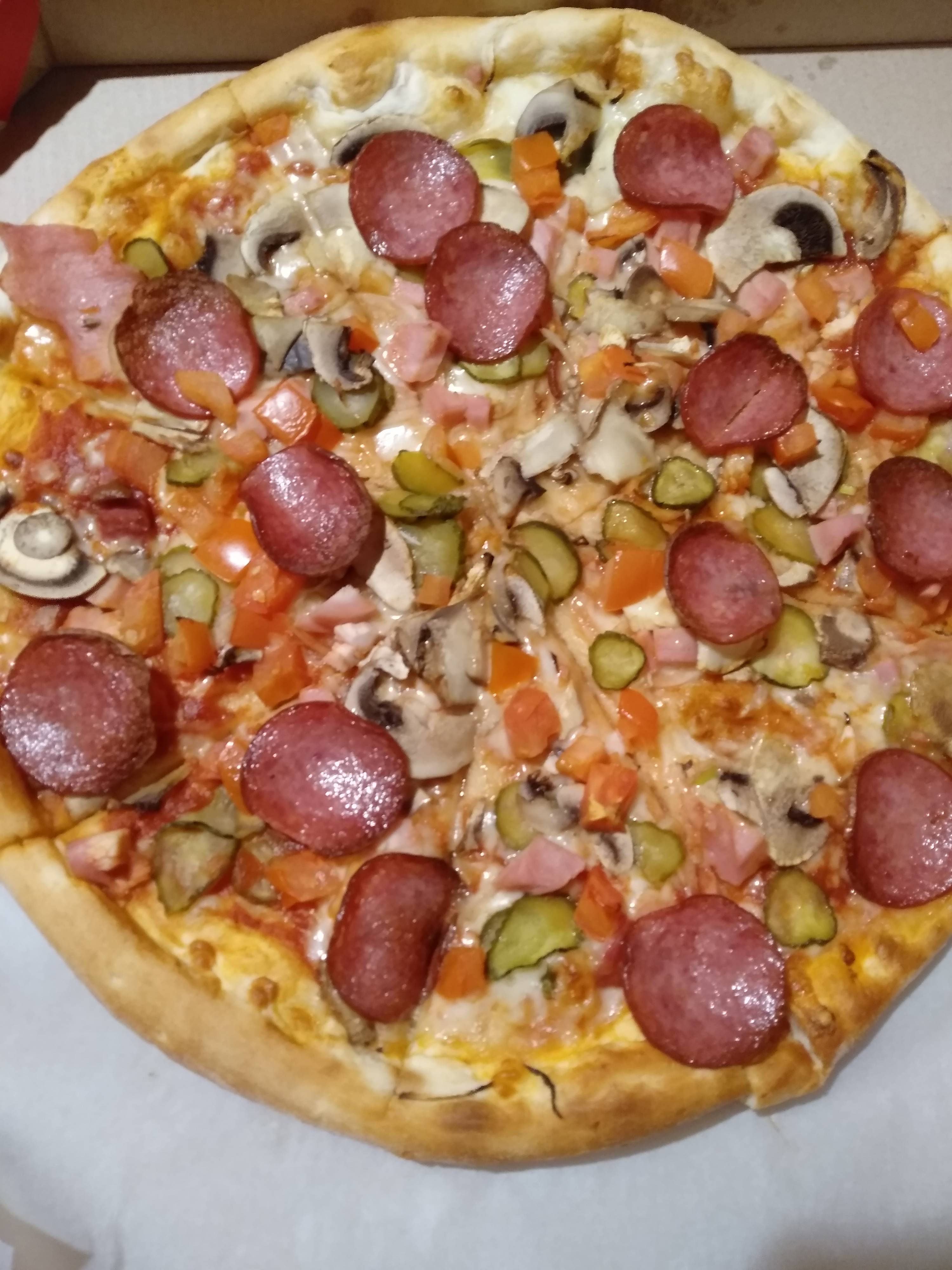 Состав: моцарелла, ветчина, грибы, колбаски охотничьи, огурец, курица, помидор, пепперони, перец сладкий, салями, перец халапеньо