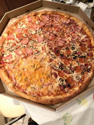 - мега-пицца "Семейная" (60 см, 2000 г): сыр моцарелла, помидор, салями, курица, огурец, ветчина, грибы, пепперони, сыр Чеддер