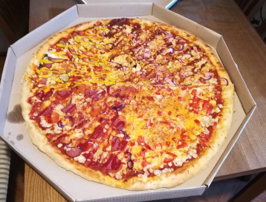 - мега-пицца "Компанейская" (60 см, 2000 г): моцарелла, пицца-соус, помидор, ветчина куриная, пепперони, бекон, лук маринованный, колбаски охотничьи, огурцы маринованные