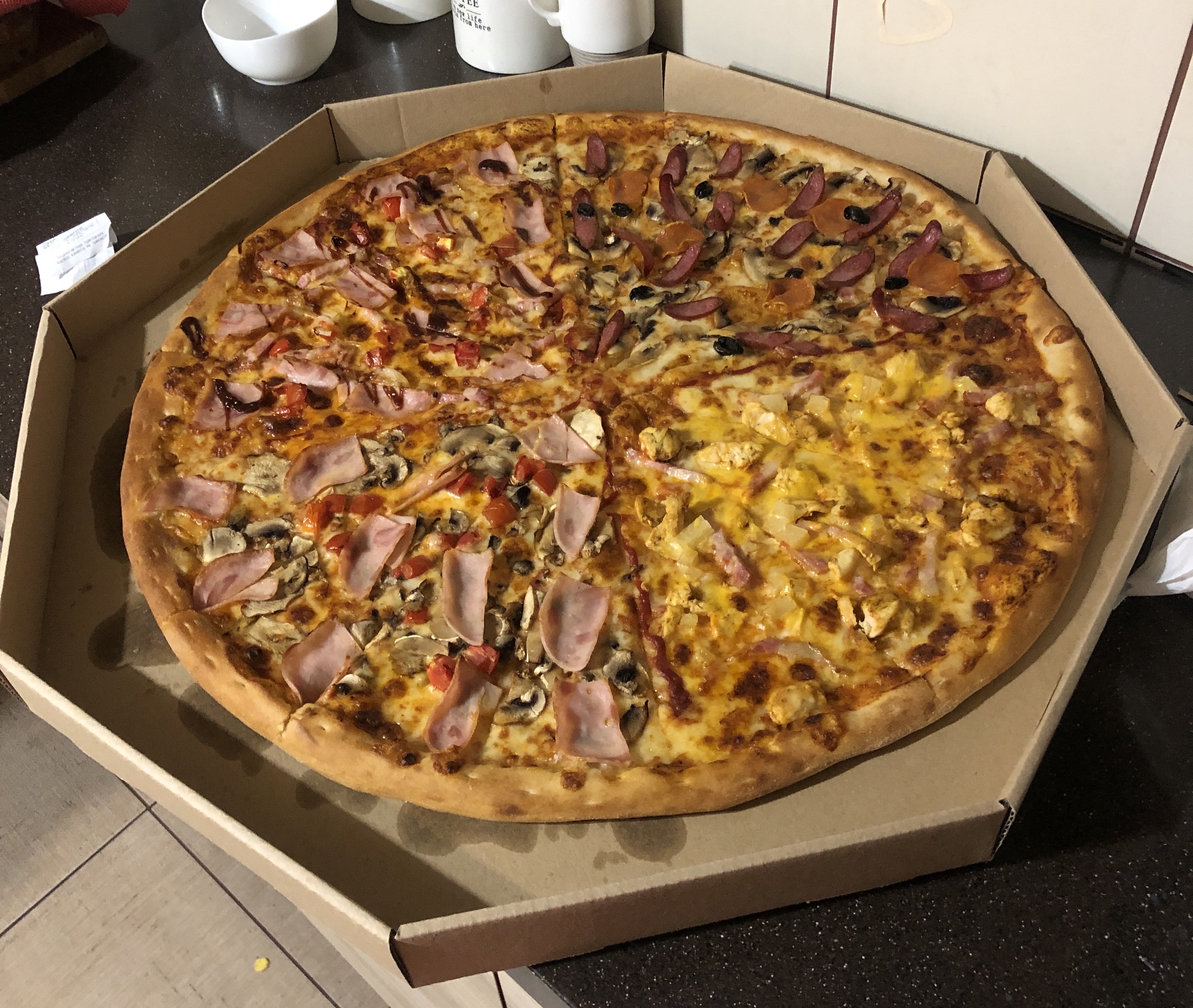 - мега-пицца "Мясная" (60 см, 2000 г): моцарелла, пицца-соус, бекон, пепперони, курица, томат, грибы, ветчина куриная, колбаски охотничьи, огурец маринованный, соус (ранч, горчичный, барбекю)