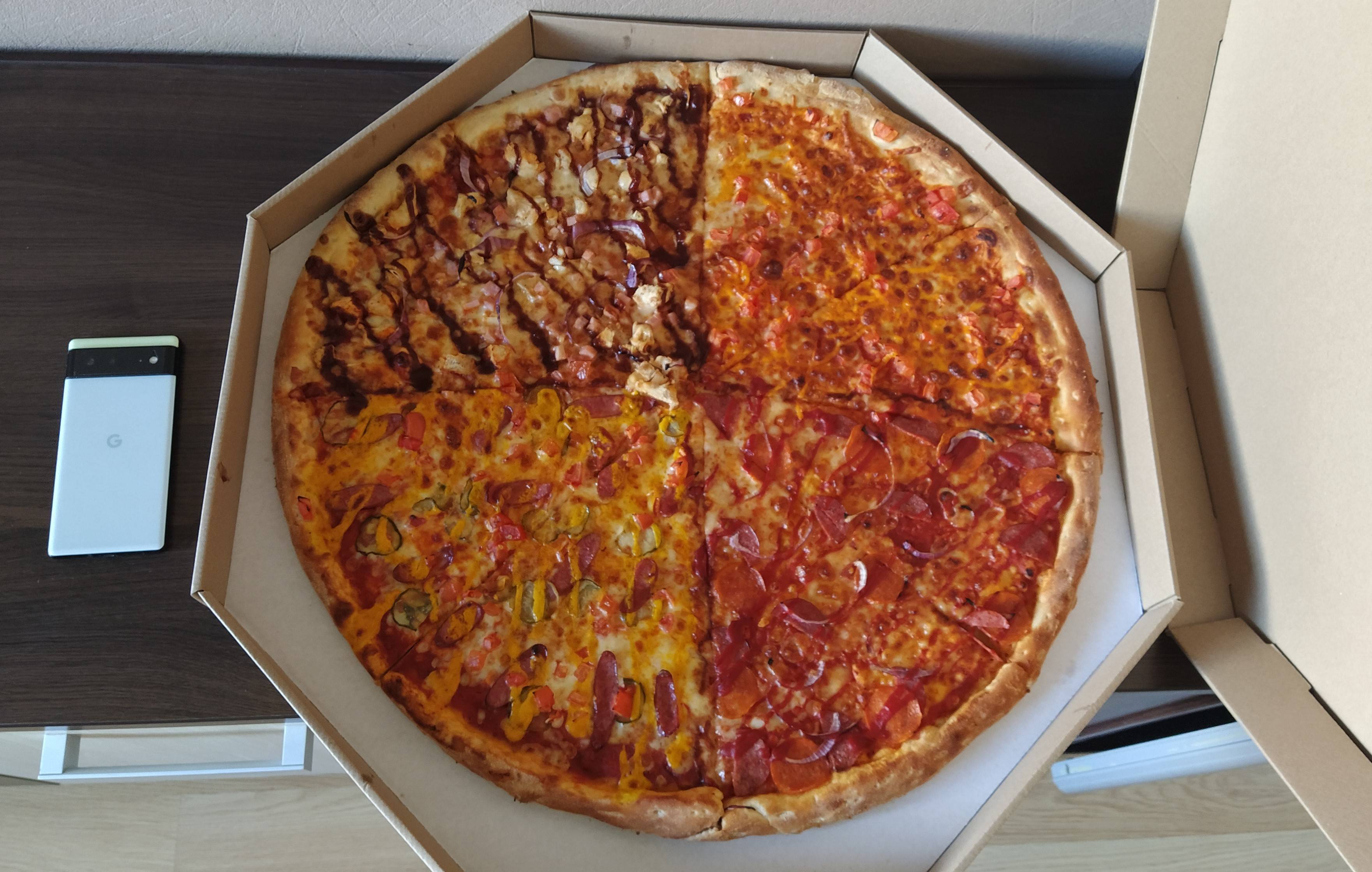 - мега-пицца "Семейная" (60 см, 2000 г): сыр моцарелла, помидор, салями, курица, огурец, ветчина, грибы, пепперони, сыр Чеддер