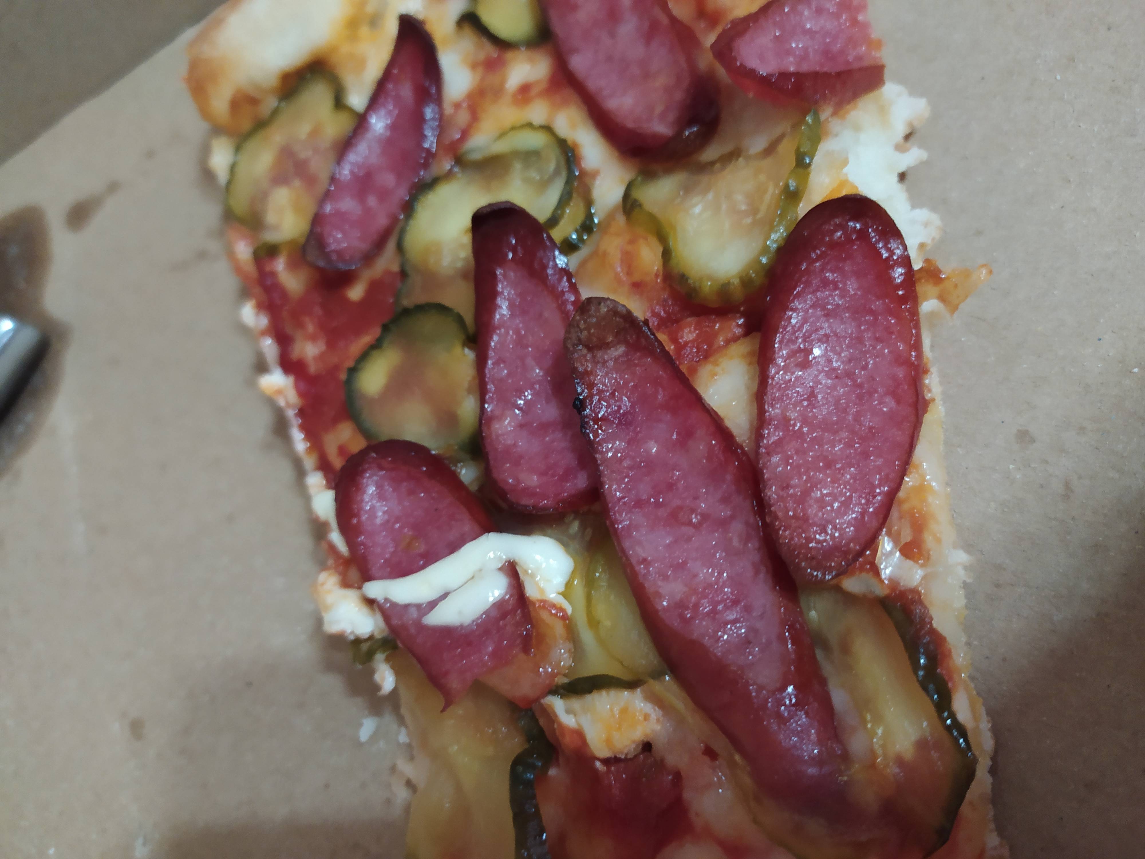 Состав: моцарелла, пицца-соус, ветчина, бекон, томат, огурец маринованный, чеддер, соус бургер