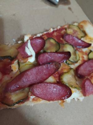 Состав: моцарелла, ветчина, грибы, колбаски охотничьи, огурец, курица, помидор, пепперони, перец сладкий, салями, перец халапеньо