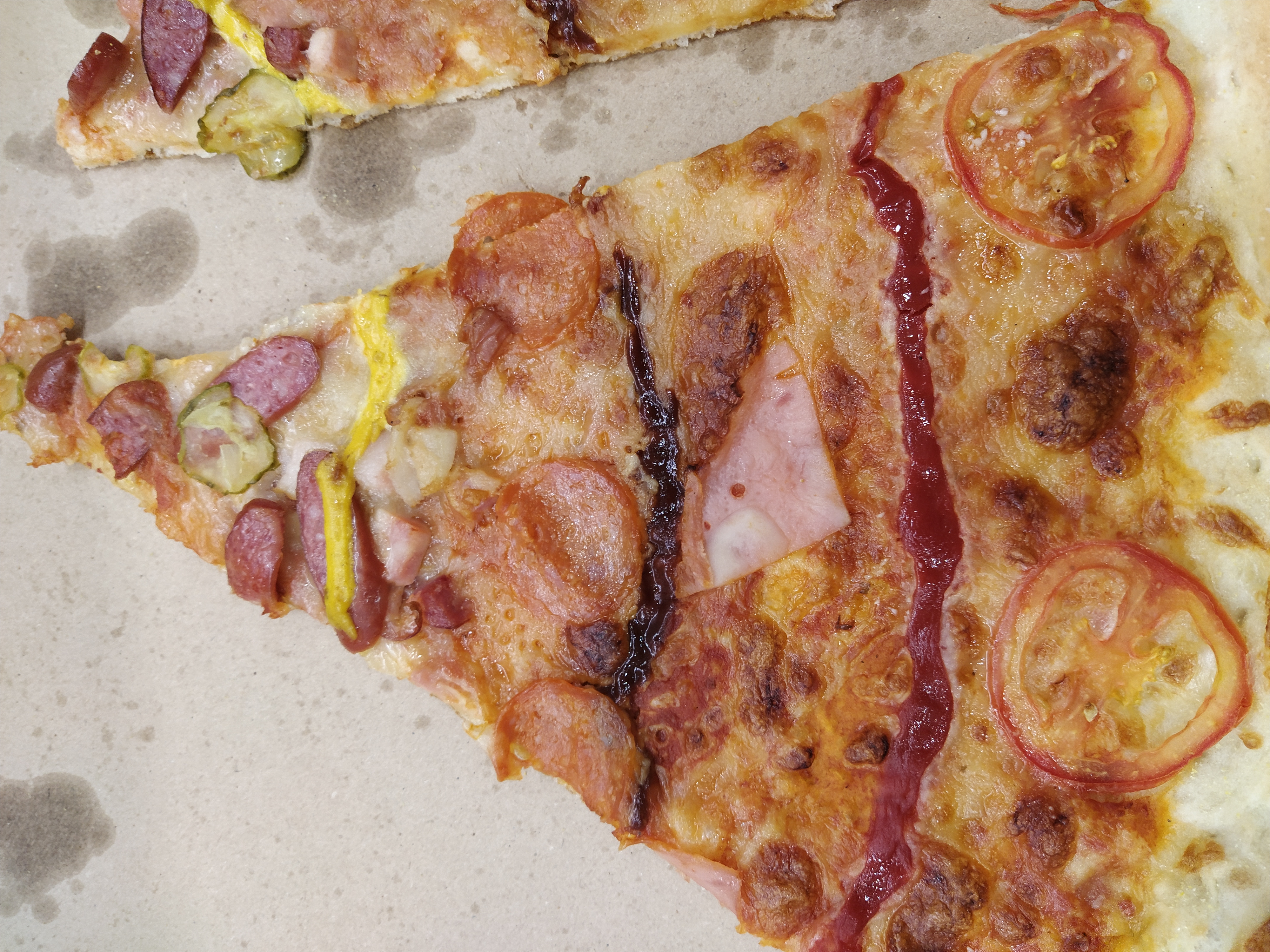 Состав: моцарелла, пицца-соус, ветчина, бекон, томат, огурец маринованный, чеддер, соус бургер