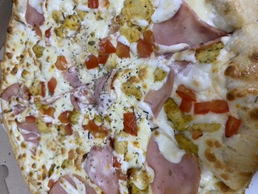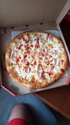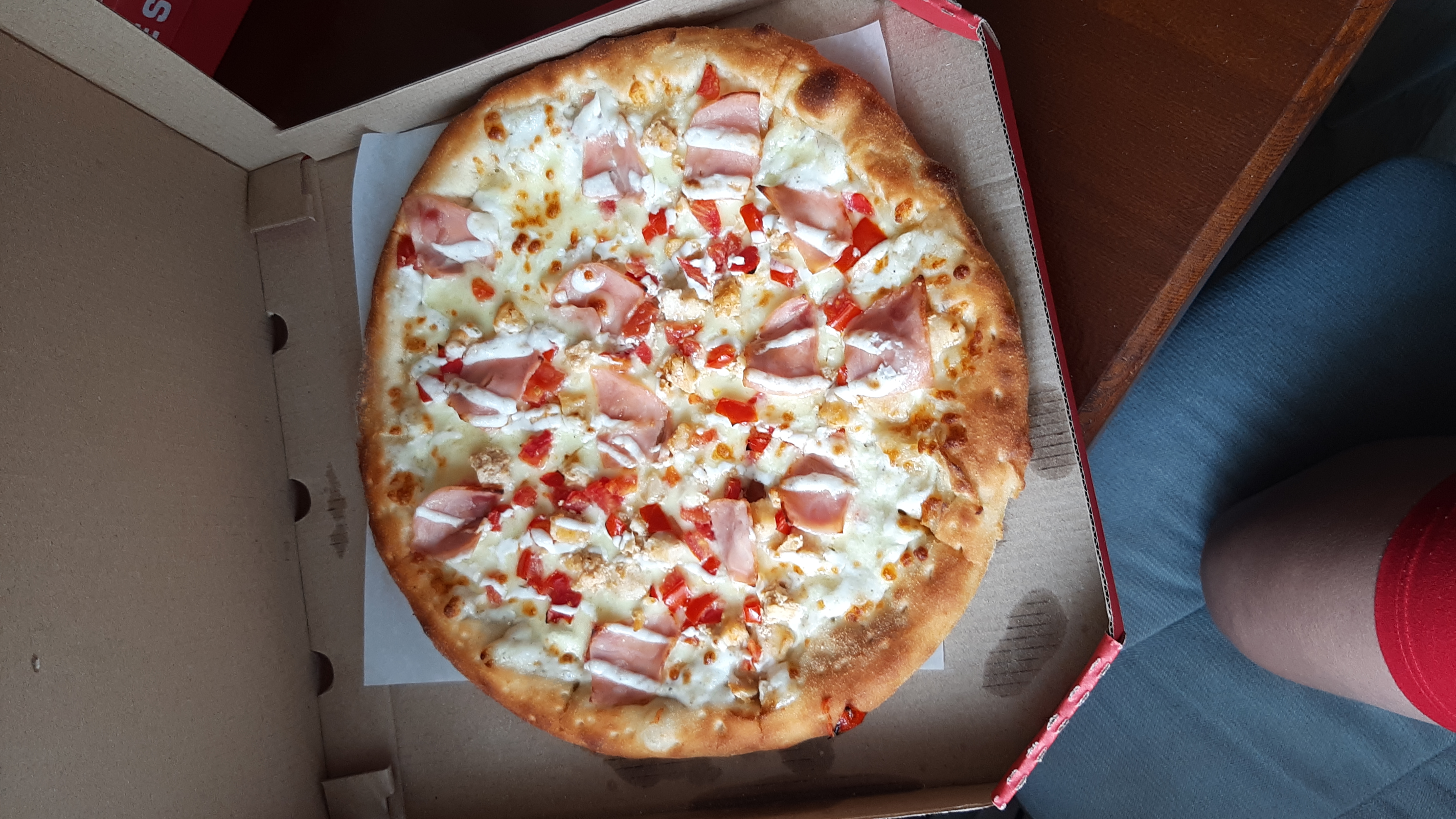 Состав: моцарелла, чесночный соус, кетчуп, ветчина, грибы, пепперони, курица, томат, фета