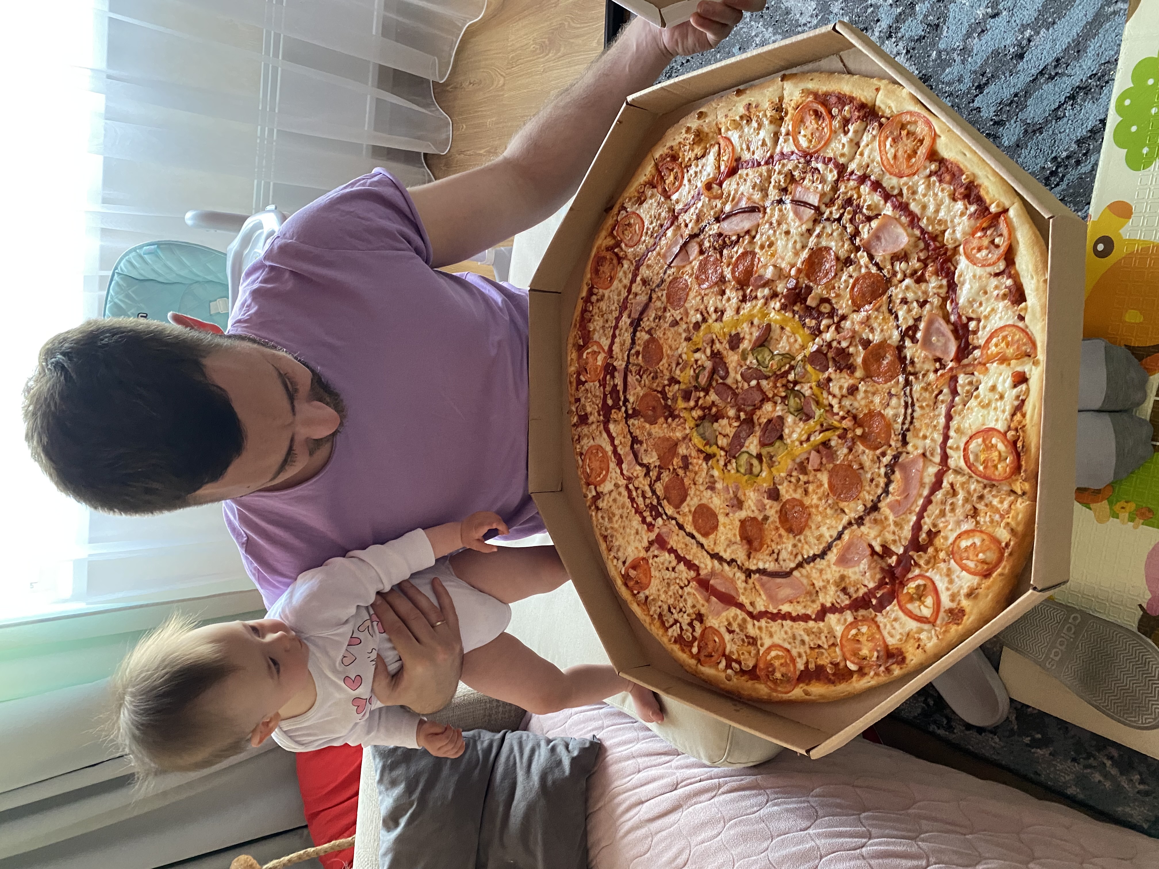 - мега-пицца "Компанейская" (60 см, 2000 г): моцарелла, пицца-соус, помидор, ветчина куриная, пепперони, бекон, лук маринованный, колбаски охотничьи, огурцы маринованные