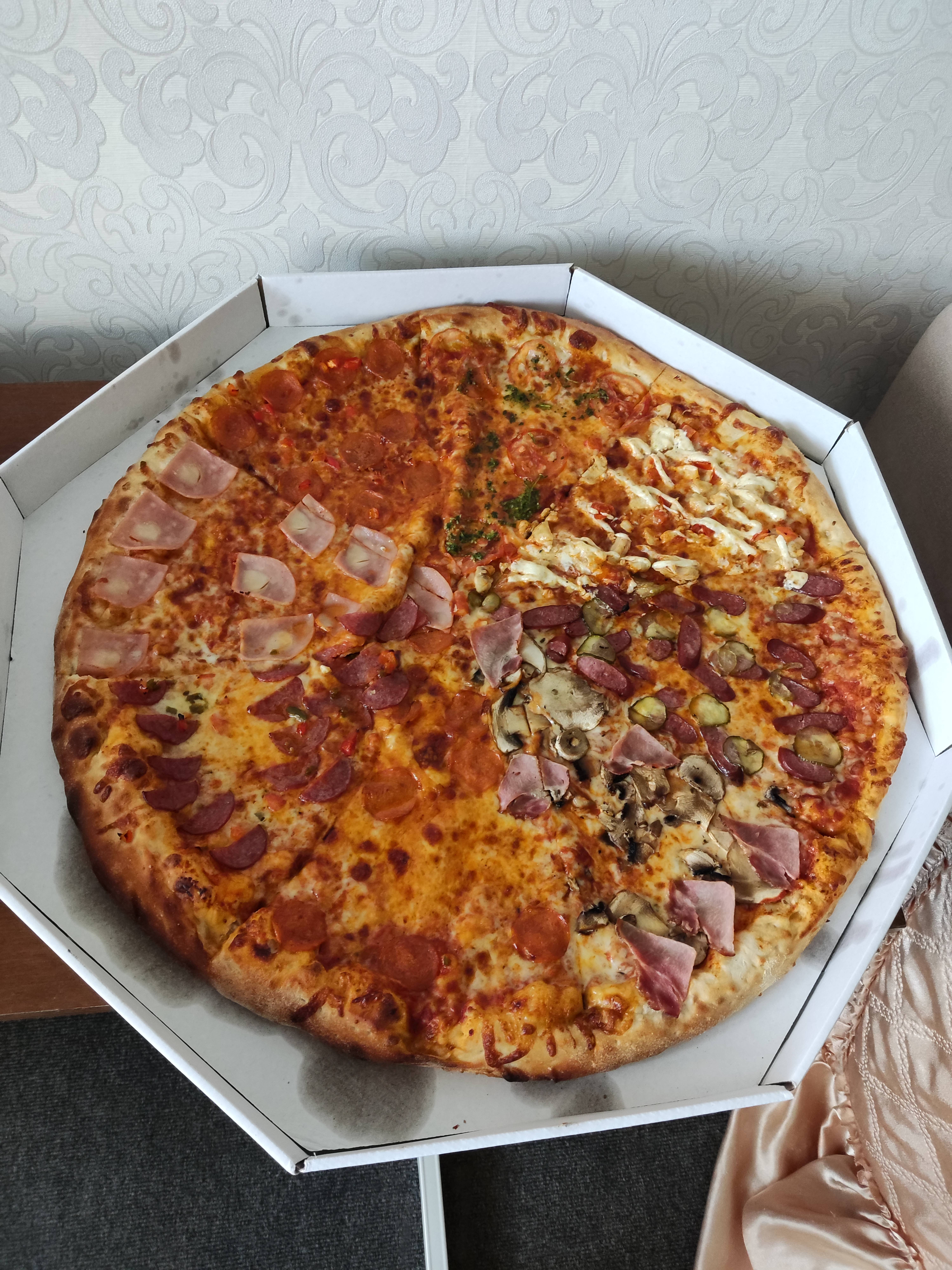 - мега-пицца "Восемь ломтиков" (60 см, 2000 г): моцарелла, ветчина, грибы, колбаски охотничьи, огурец, курица, помидор, пепперони, перец сладкий, салями, перец халапеньо