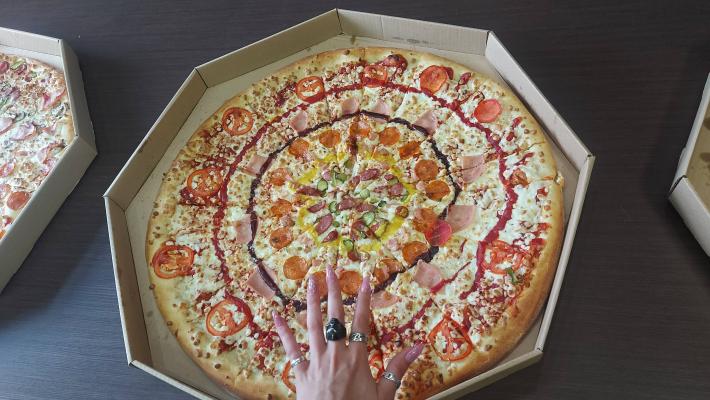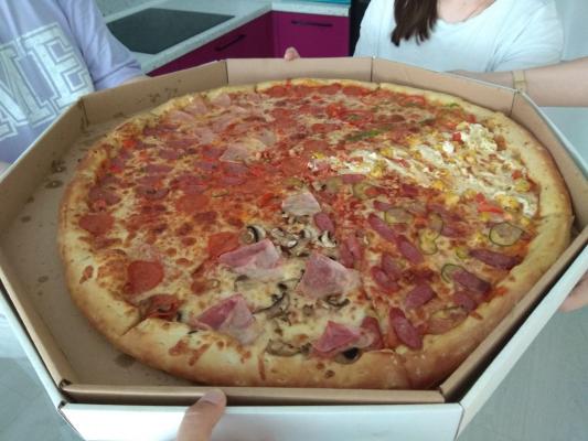 - мега-пицца "Семейная" (60 см, 2000 г): сыр моцарелла, помидор, салями, курица, огурец, ветчина, грибы, пепперони, сыр Чеддер