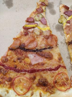 Состав: пицца-соус, моцарелла, бекон, салями, пеперони, огурец маринованный, помидор, соус горчичный