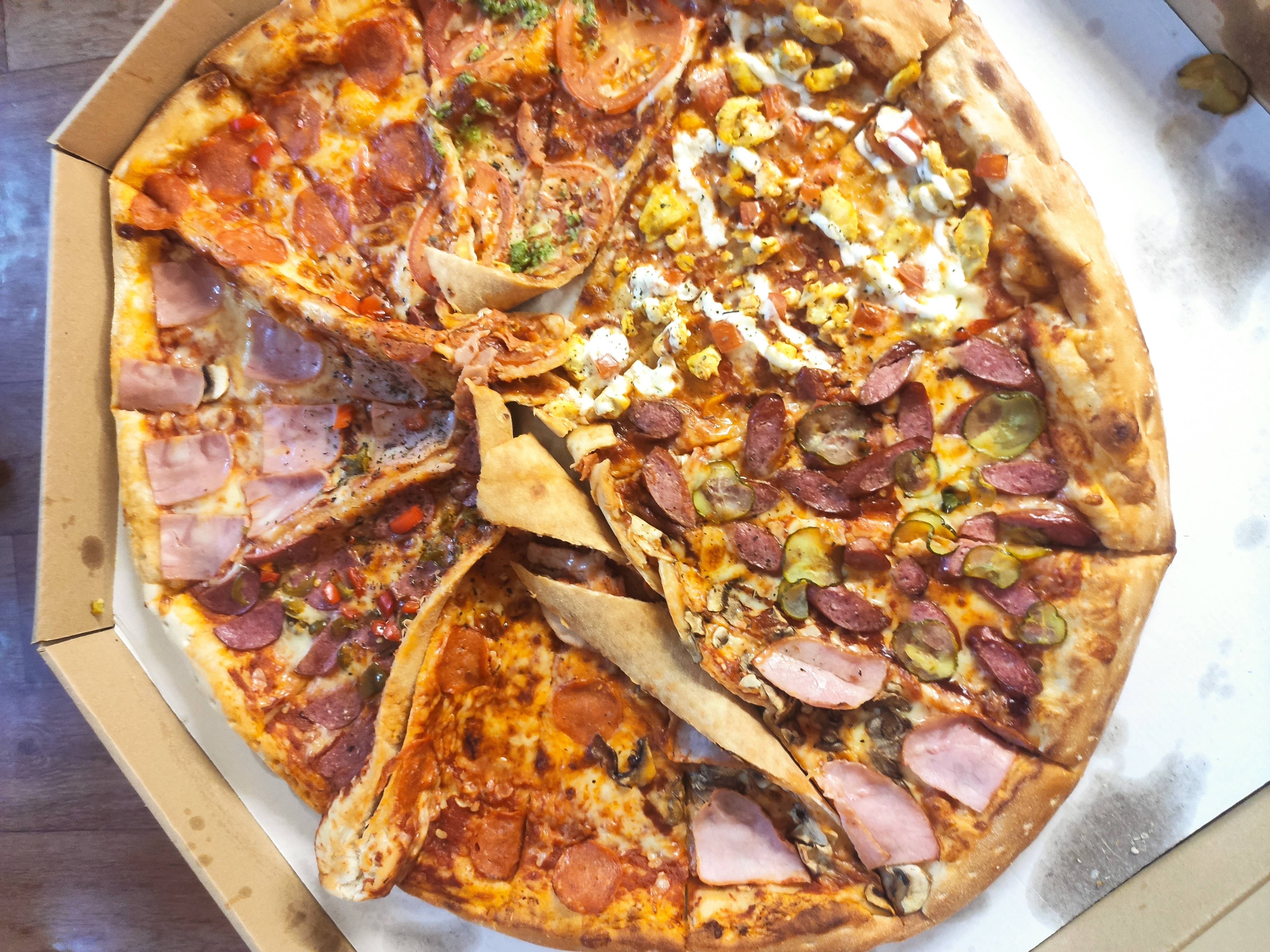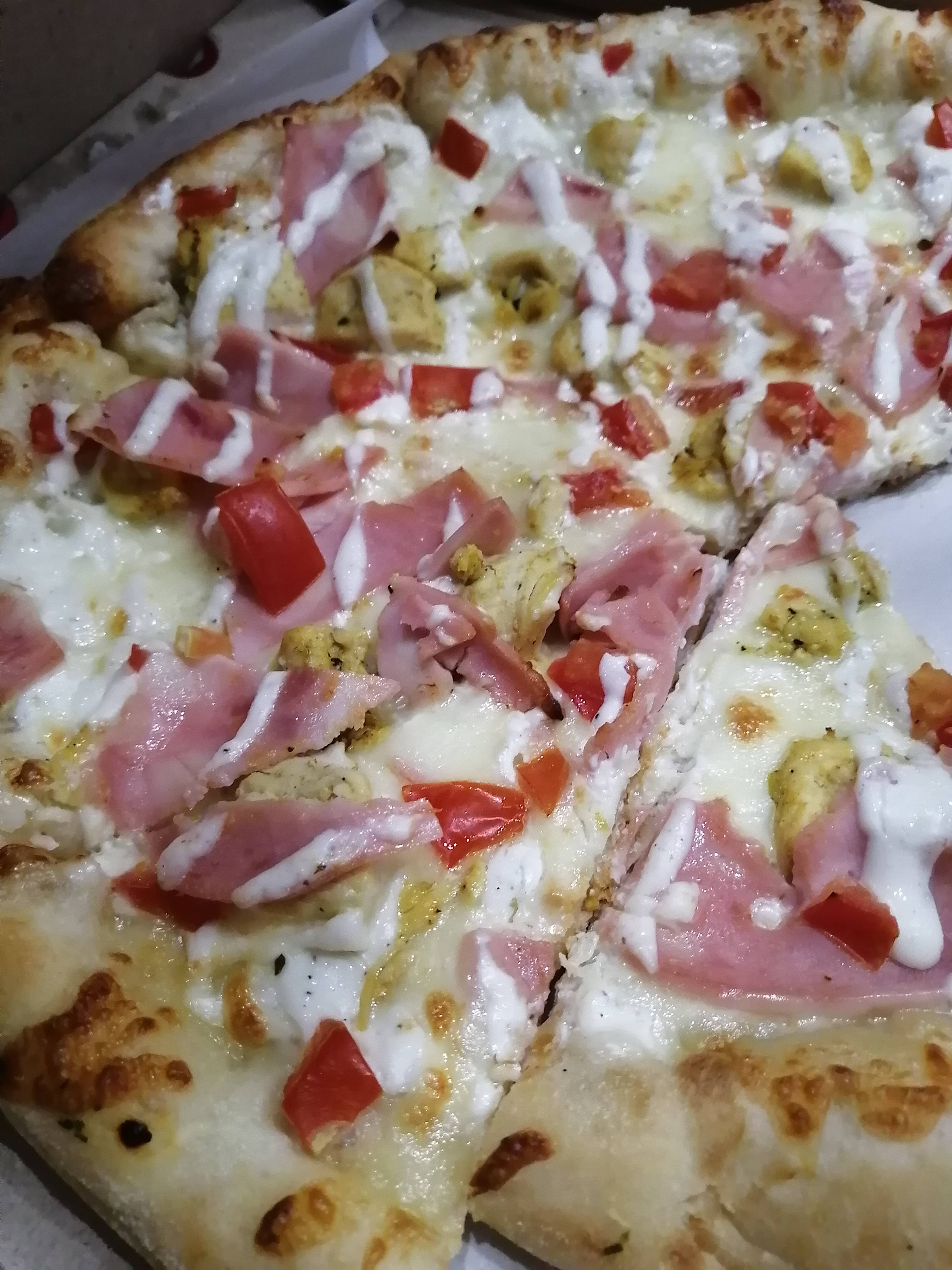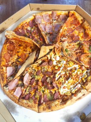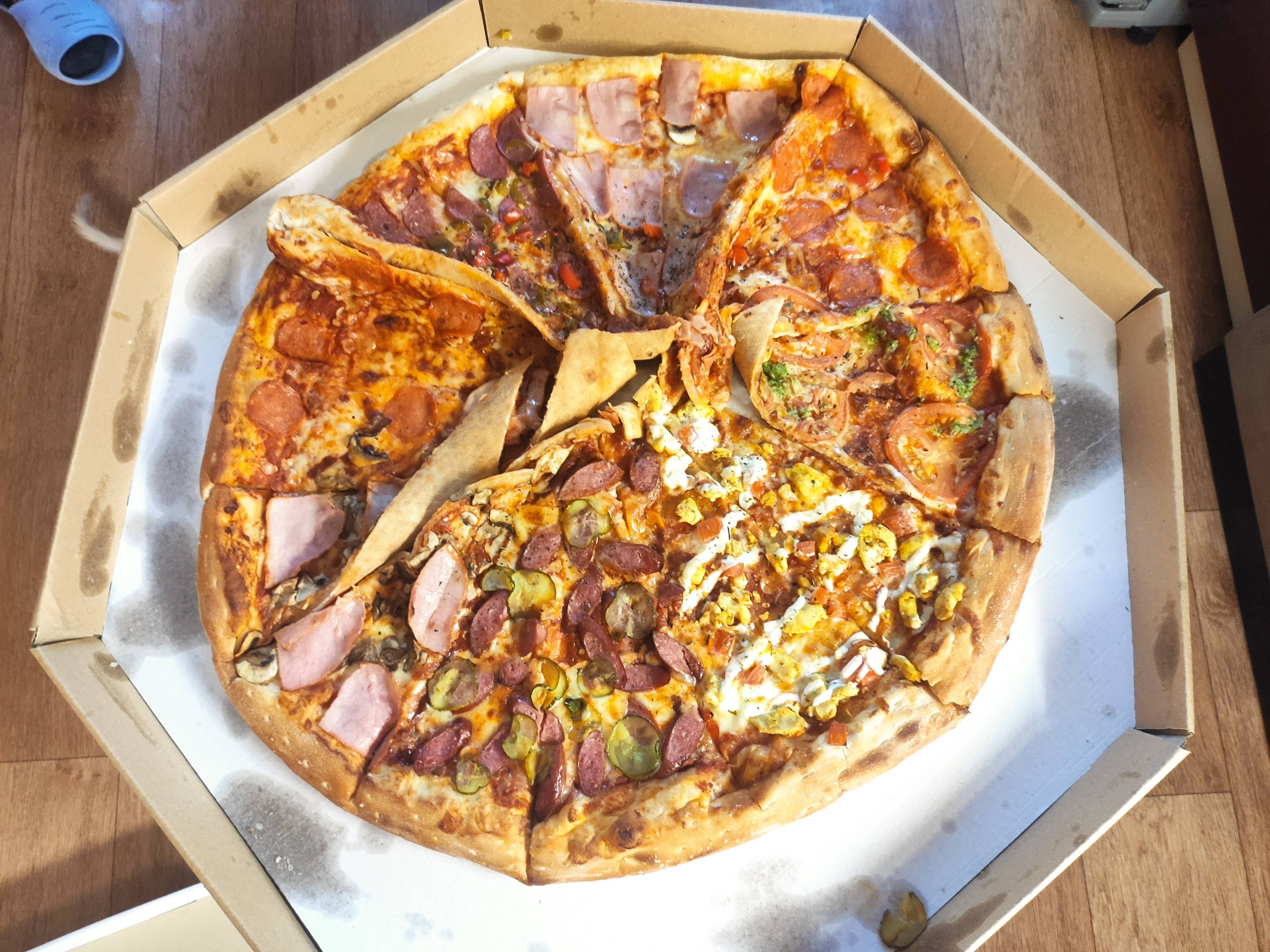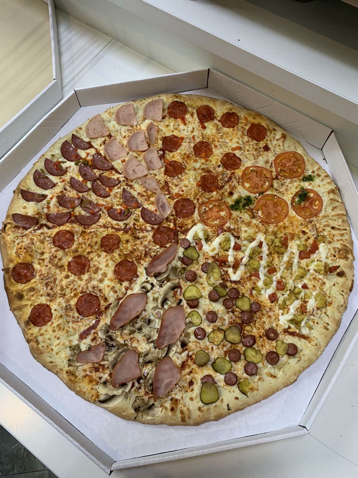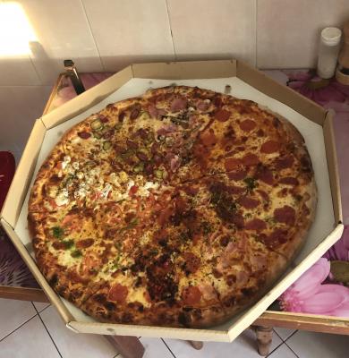 обычно заказываем 2 пиццы по 36см на свою не большую семью и не остаётся ни кусочка,а здесь осталось половина, потому что никто просто не хотел это есть ,т к было не вкусно