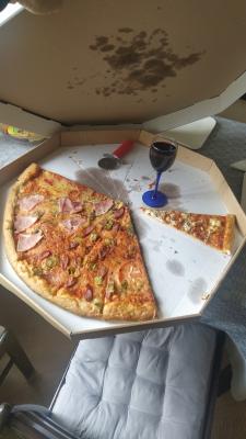 Привезли вовремя, спасибо. Пицца огромная! Мы были в восторге от размера. Брали 8 ломтиков. Хорошая пицца за такие деньги, правда соуса не хватает, добавьте пожалуйста, она будет сочнее, а так всё отлично )