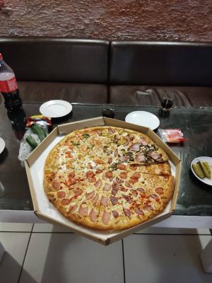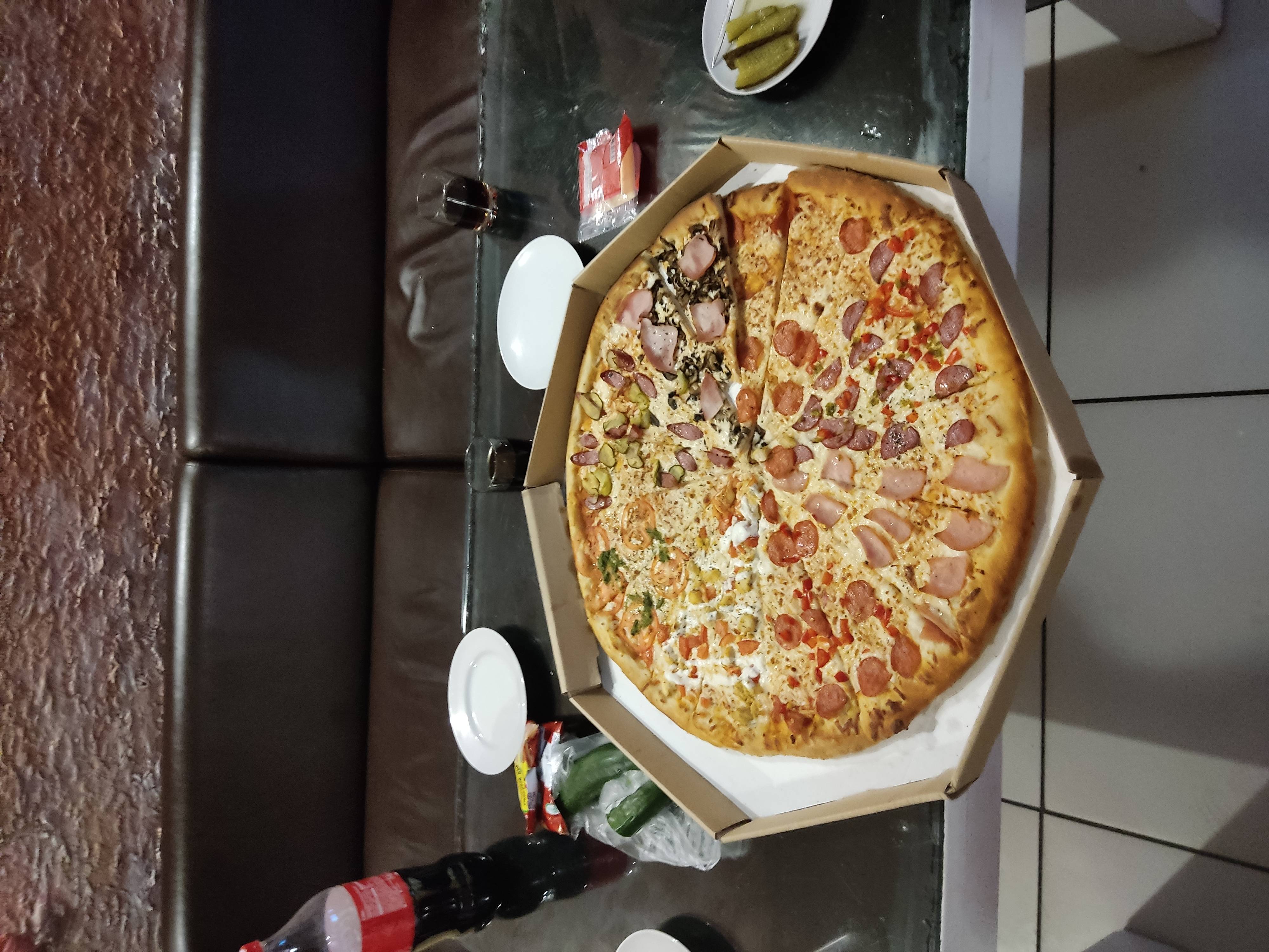 - мега-пицца "Компанейская" (60 см, 2000 г): моцарелла, пицца-соус, помидор, ветчина куриная, пепперони, бекон, лук маринованный, колбаски охотничьи, огурцы маринованные