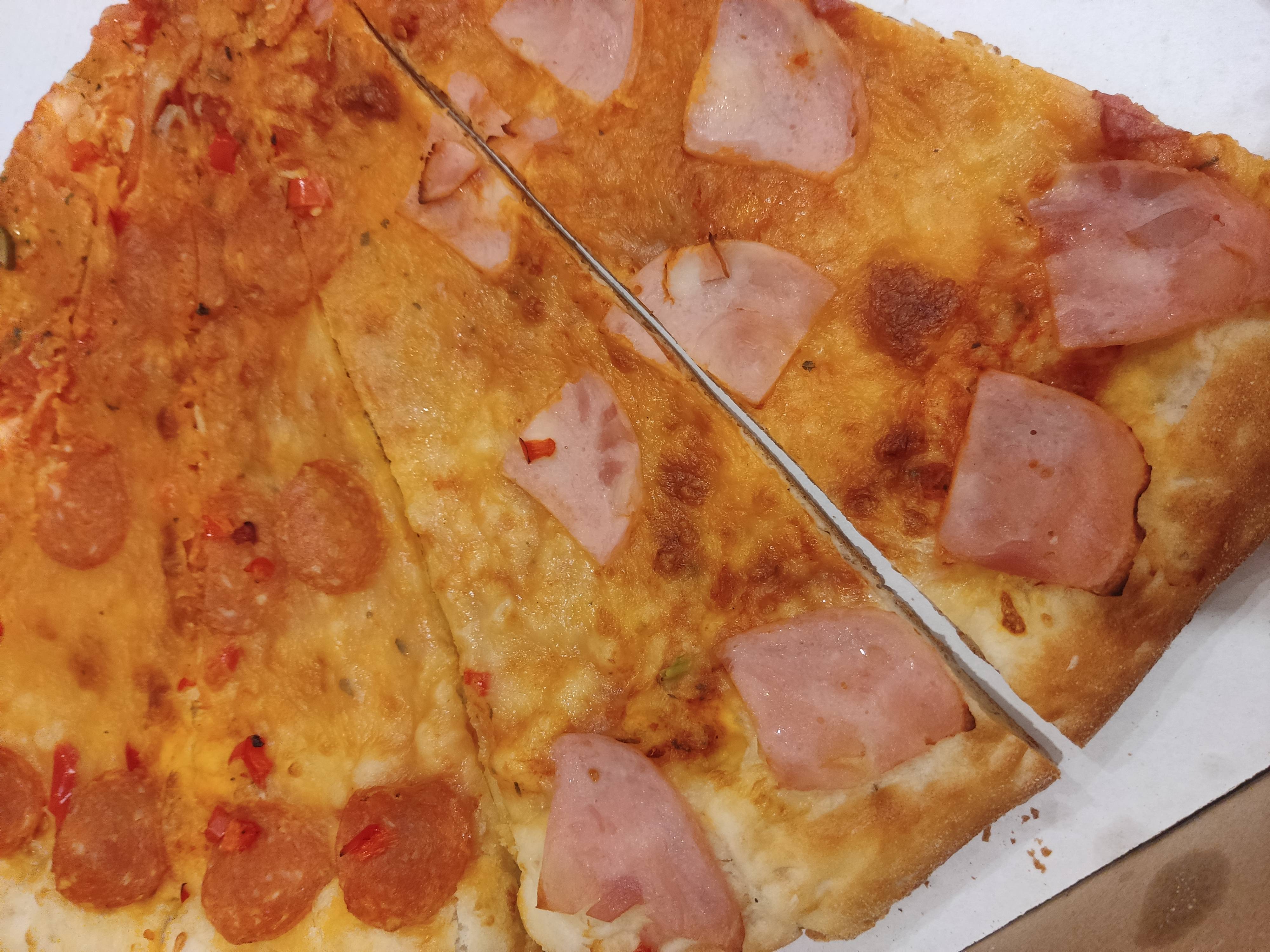 - мега-пицца "Восемь ломтиков" (60 см, 2000 г): моцарелла, ветчина, грибы, колбаски охотничьи, огурец, курица, помидор, пепперони, перец сладкий, салями, перец халапеньо