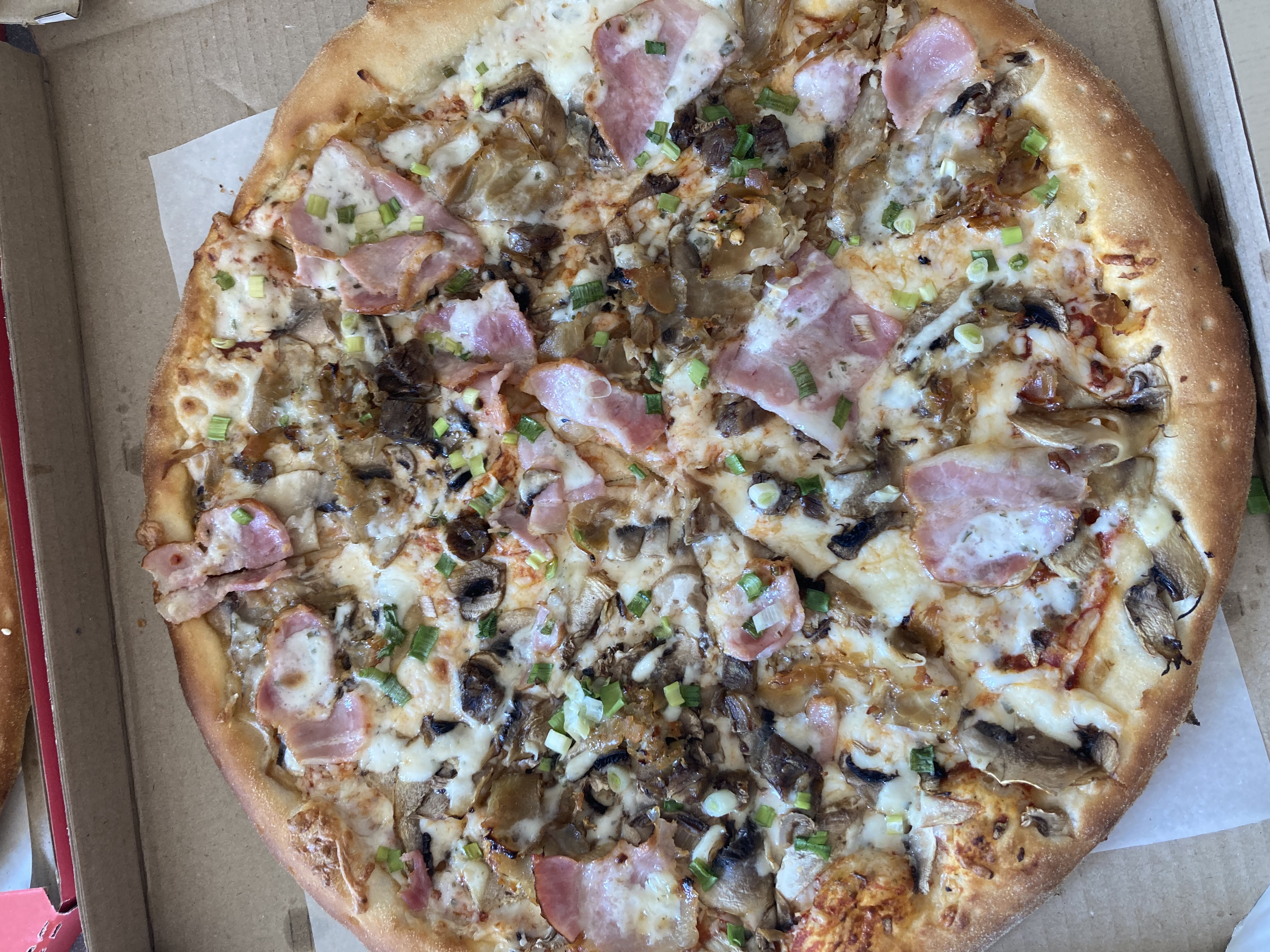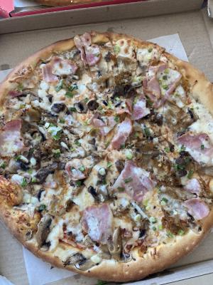 Состав: моцарелла, бекон, свинина, грибы, лук репчатый