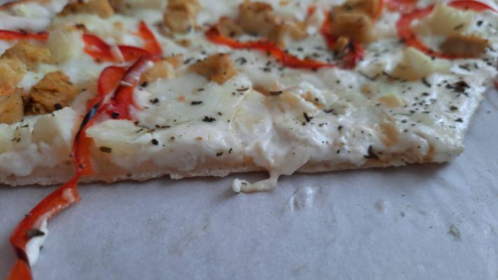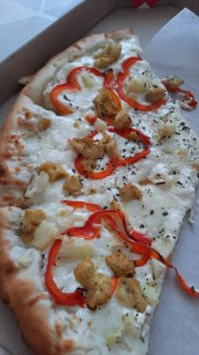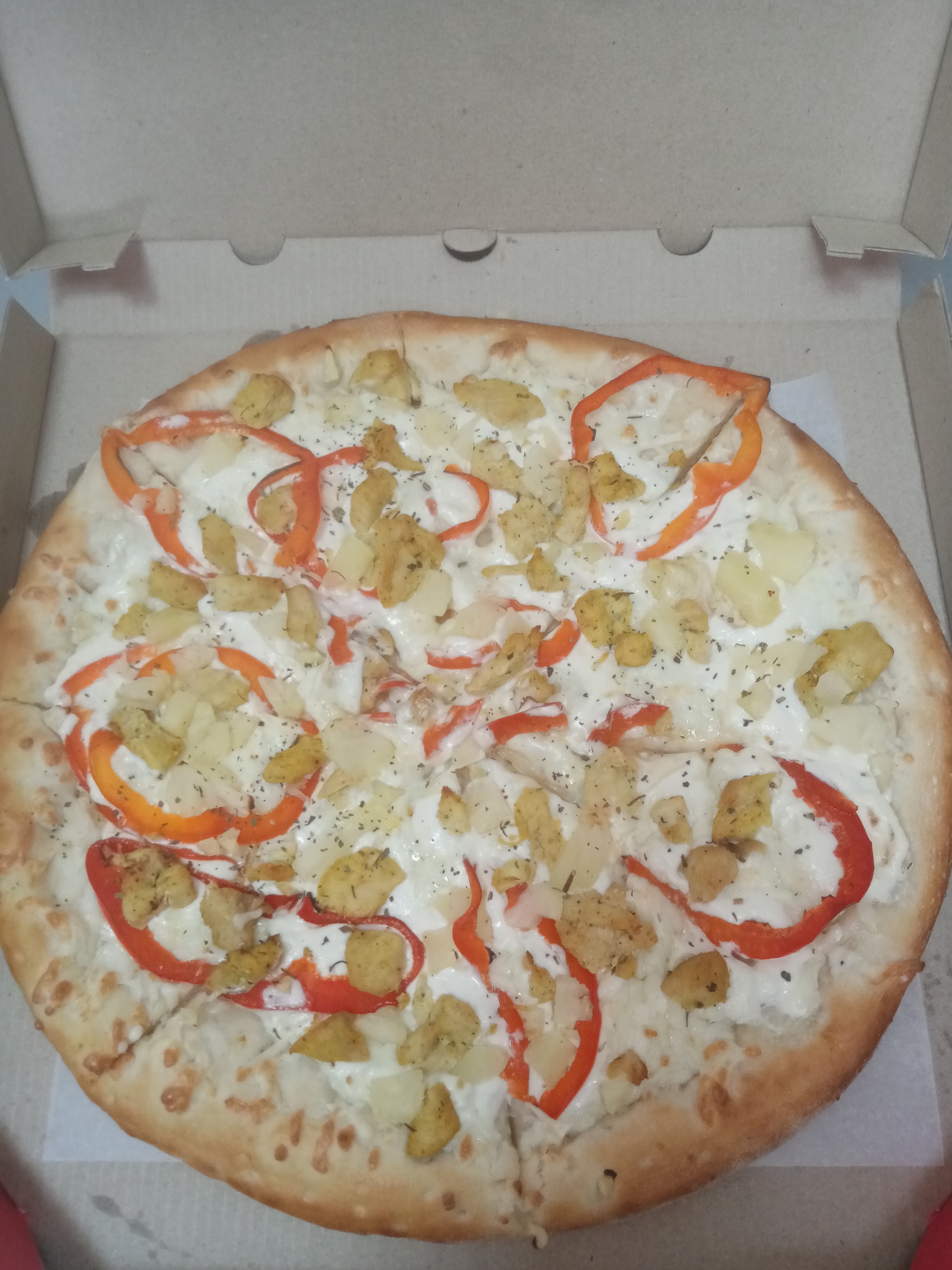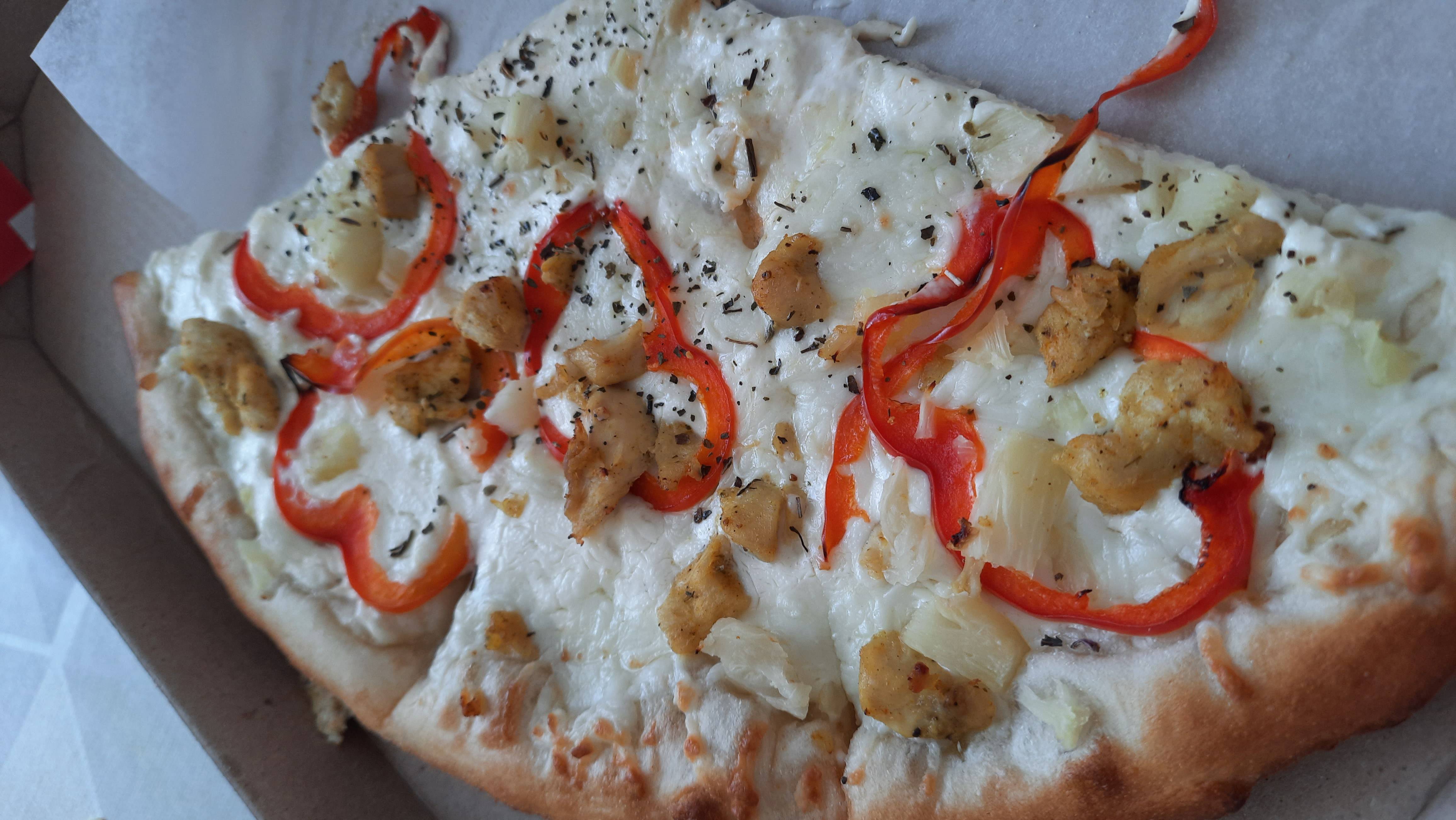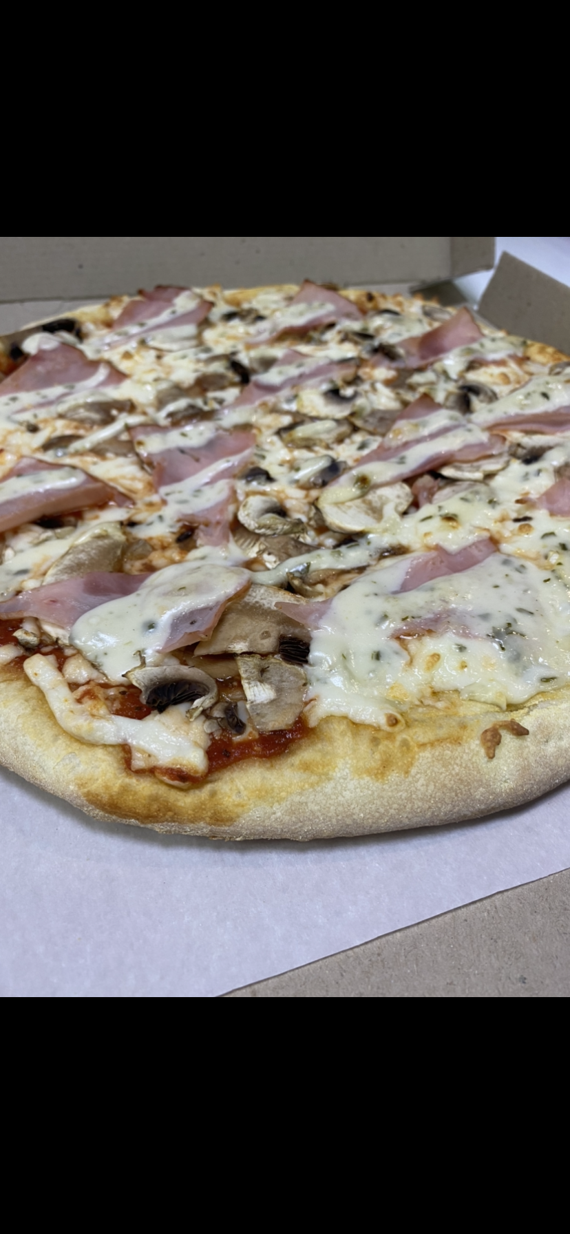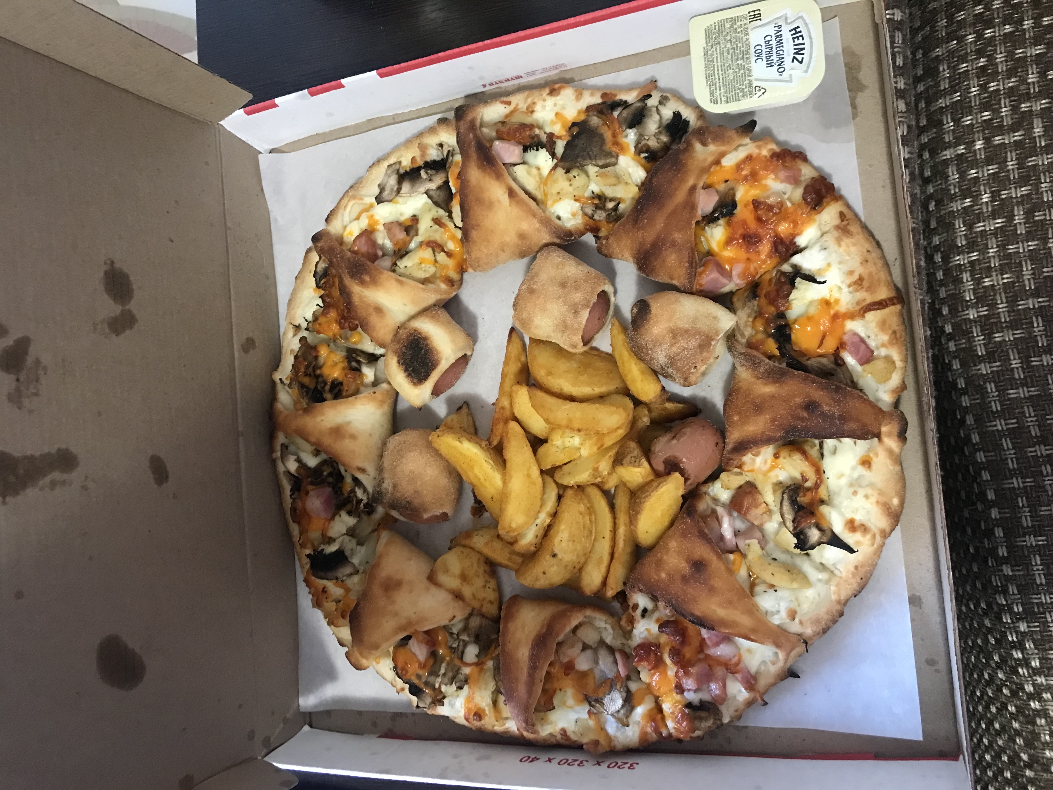 Состав: моцарелла, чесночный соус, кетчуп, ветчина, грибы, пепперони, курица, томат, фета