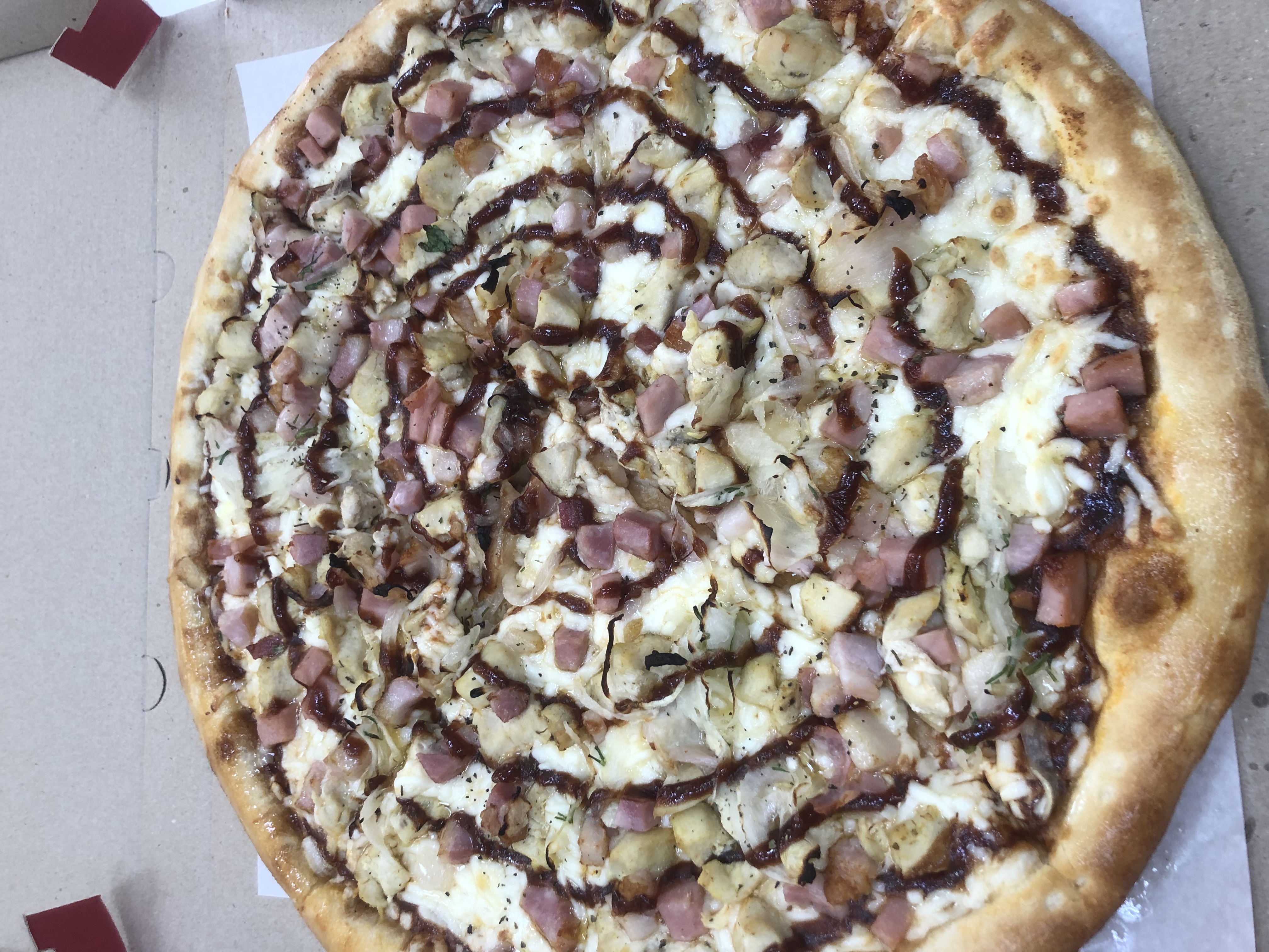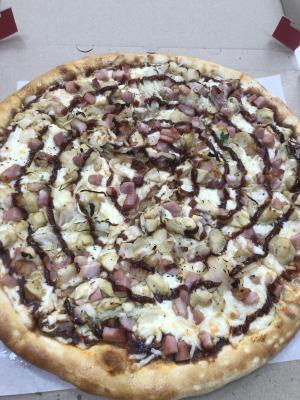 Состав: пицца-соус, моцарелла, колбаски охотничьи, пепперони, салями, курица, бекон, помидор, огурец маринованный, соус горчичный, соус барбекю, лук маринованный, сыр чеддер
