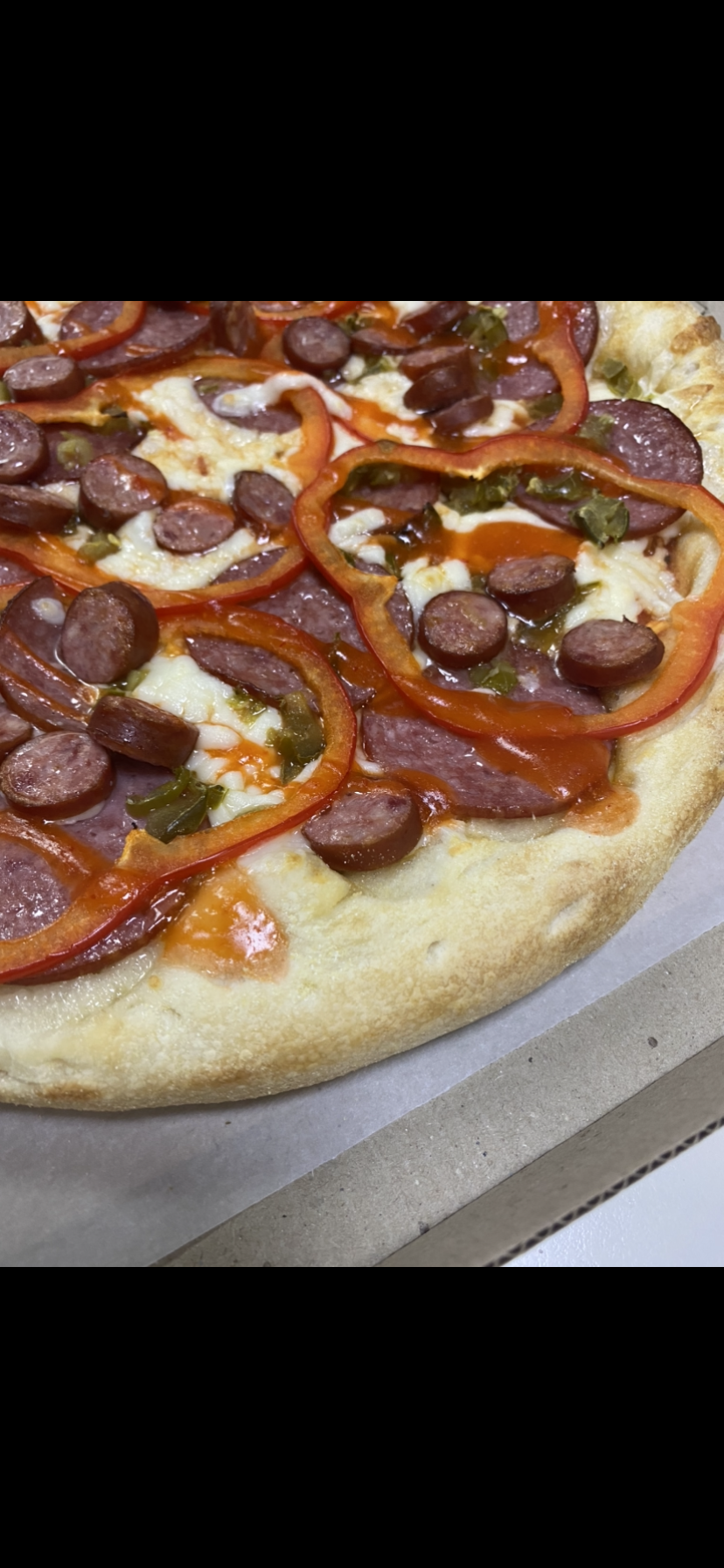 Состав: моцарелла, ветчина, грибы, колбаски охотничьи, огурец, курица, помидор, пепперони, перец сладкий, салями, перец халапеньо